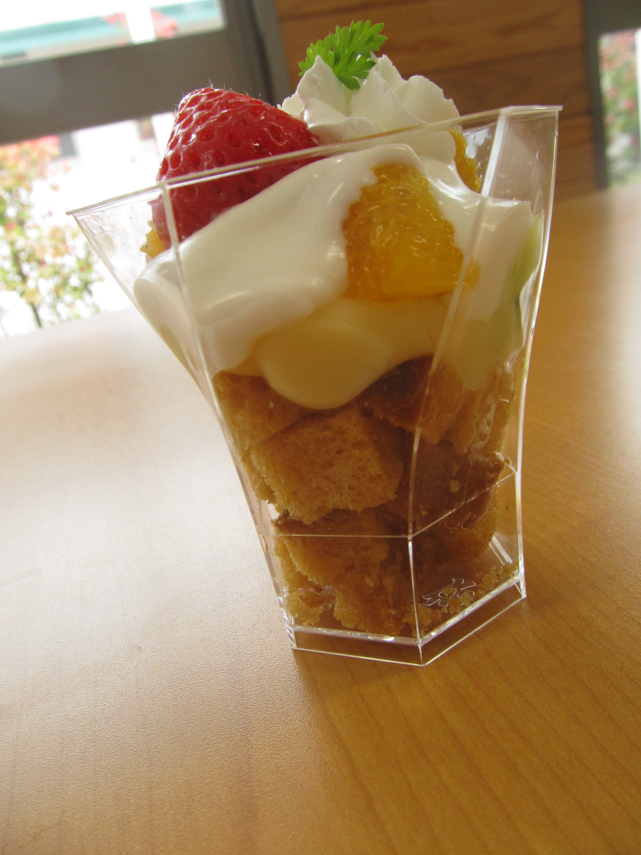 い)、泡立てたクリームで作る。以上の材料を層状に重ね、フルーツとスポンジケーキを下に、カス
