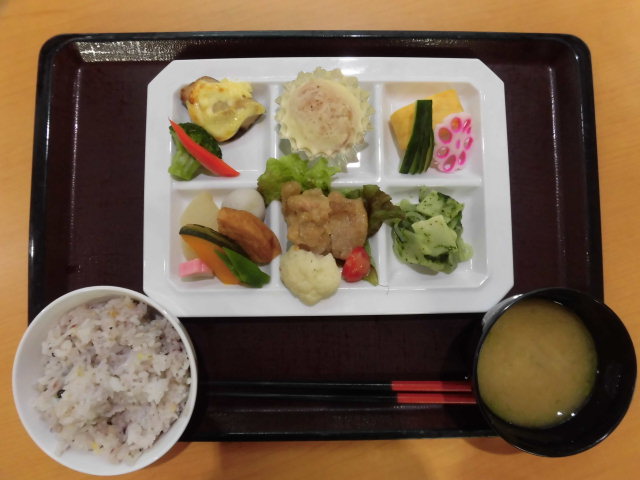 (献立)十六穀米飯、彩りプレート、なめこ汁
