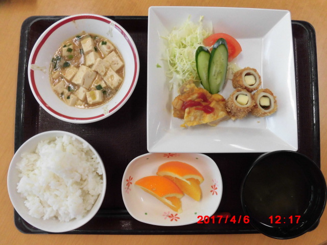 (献立)ご飯、コンビメニュー、麻婆豆腐、わかめスープ、オレンジ
