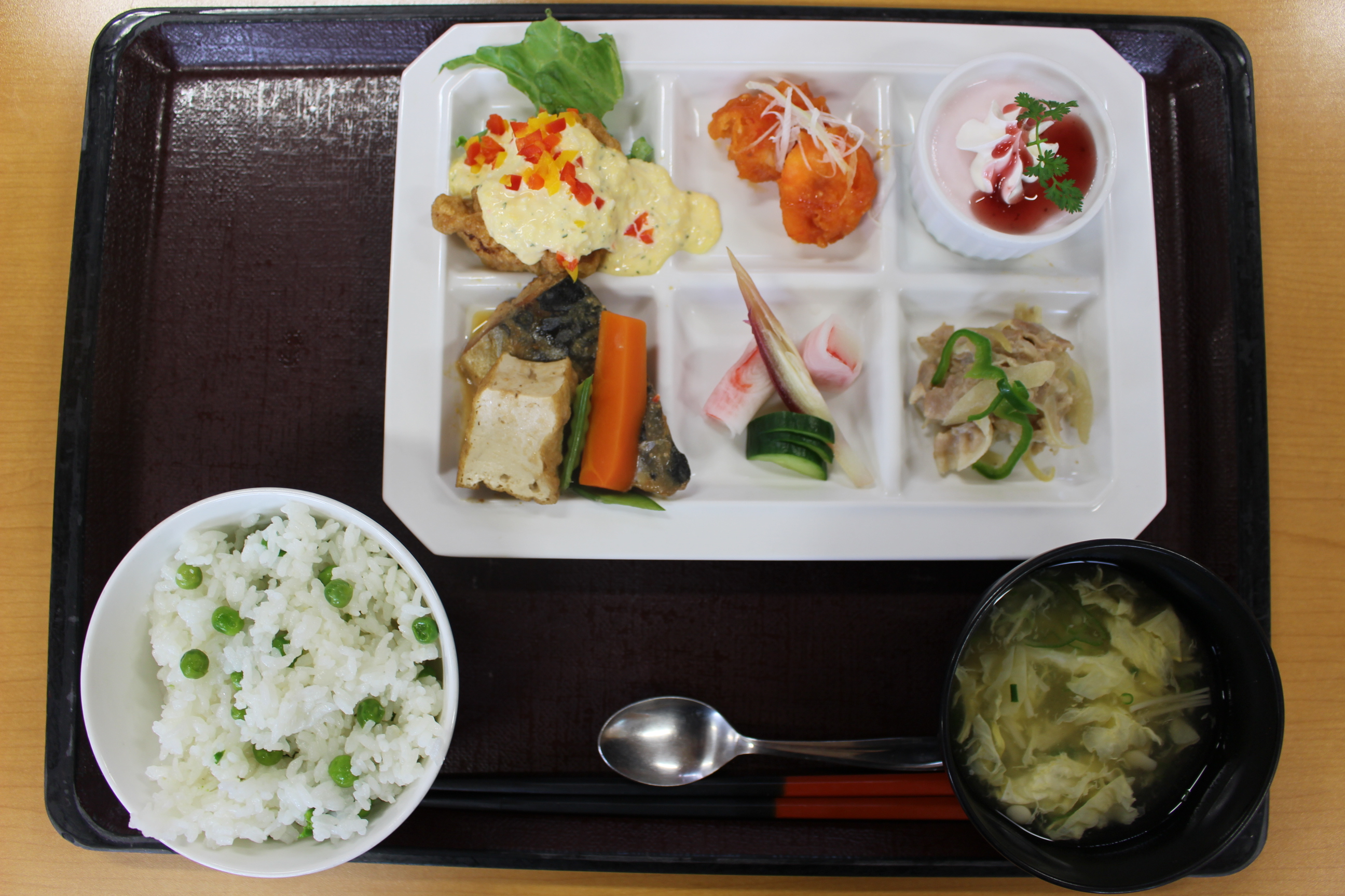 (献立)豆ご飯、彩りプレート、かき玉汁