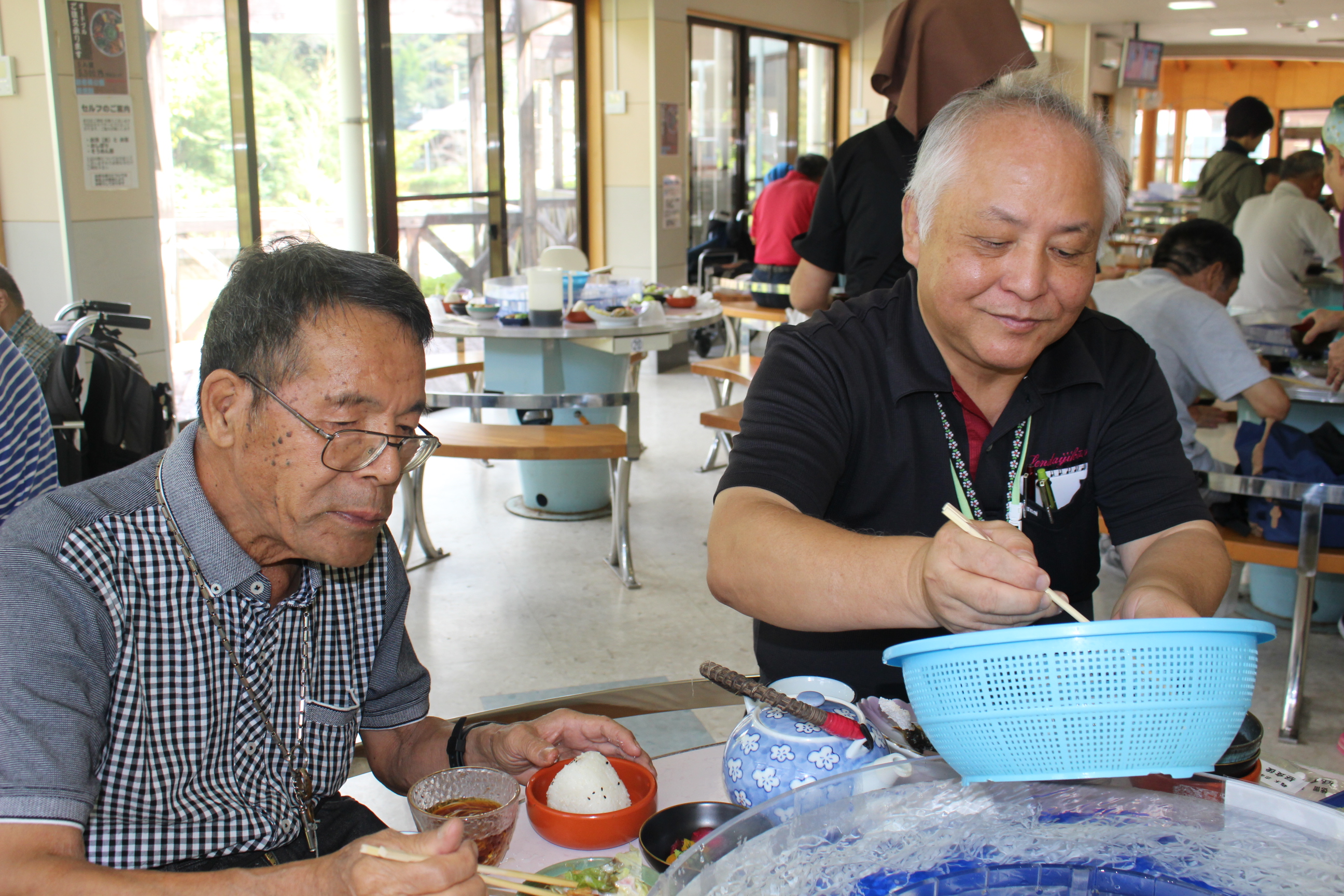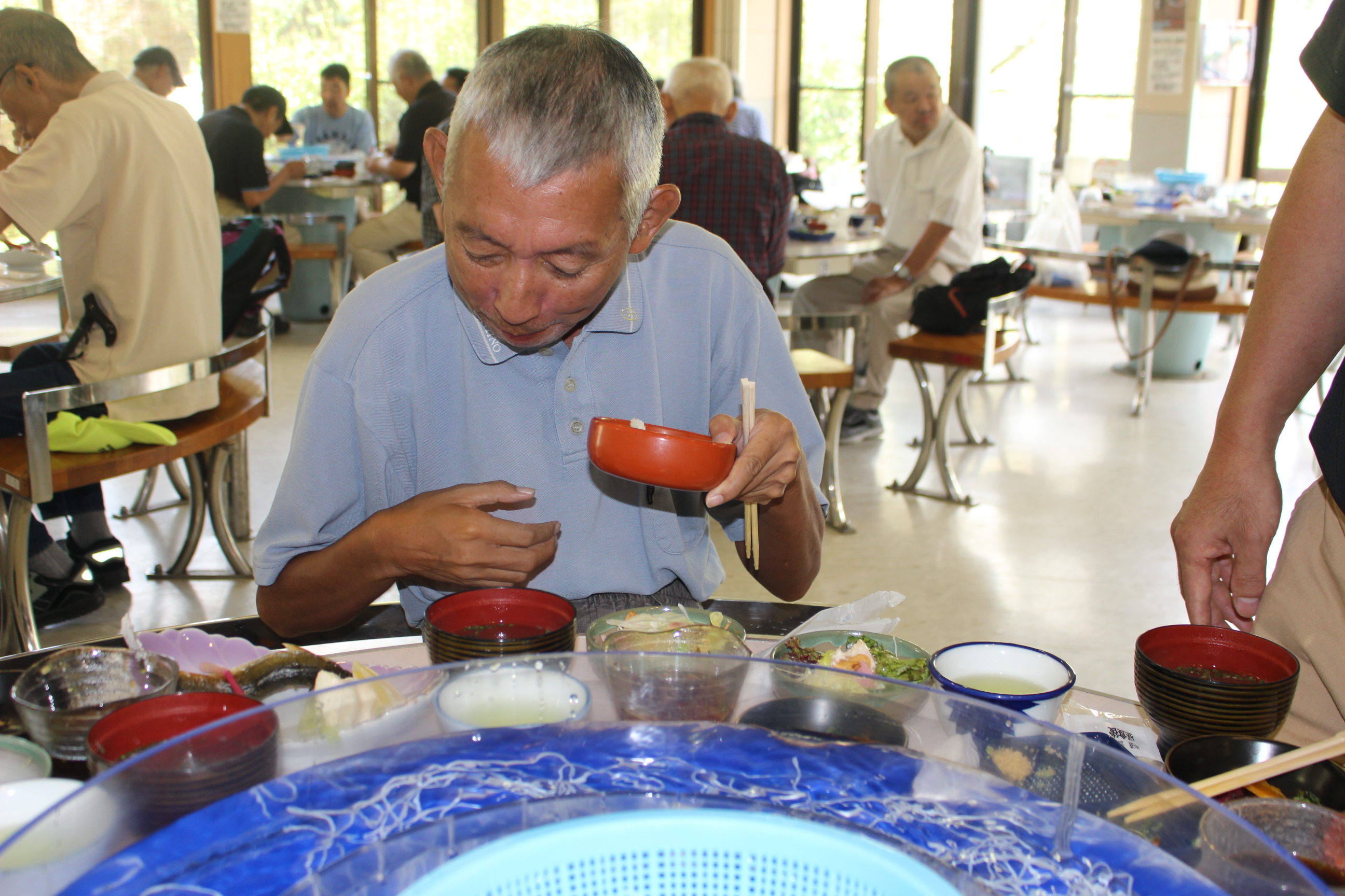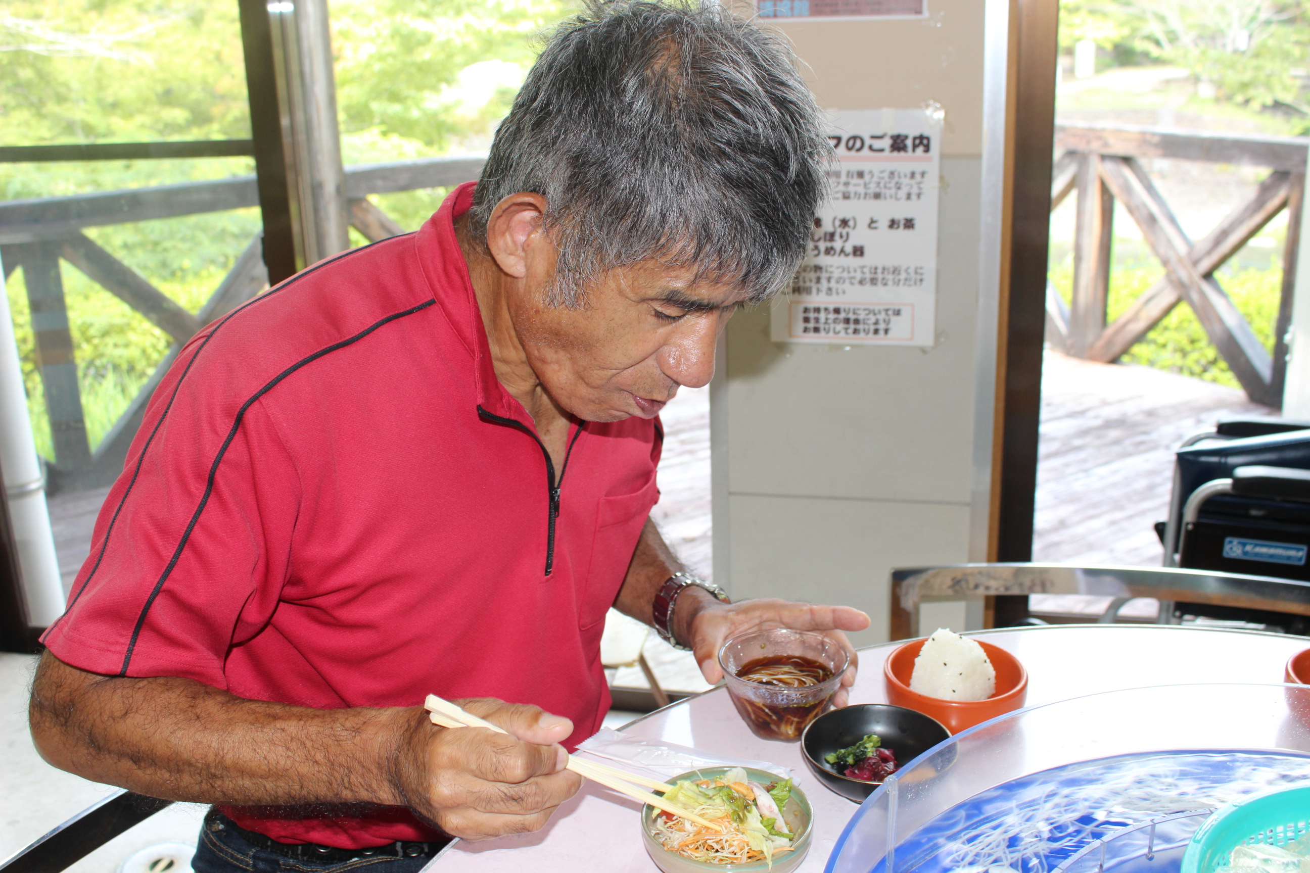 お盆期間の未帰省者外出として,利用者の皆さんから希望として,そうめん流しと温泉を楽しみたいとの意見があり,9月10日に観音滝公園に行ってきました。観音滝公園ではまず,お昼ご飯のそうめん流しを楽しみました。この時期ならではの食事に,皆さん満足そうな表情でした。