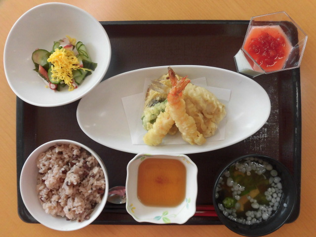 (献立)赤飯、秋野菜の天ぷら、タコときゅうりの酢の物、なめことオクラのとろみ汁