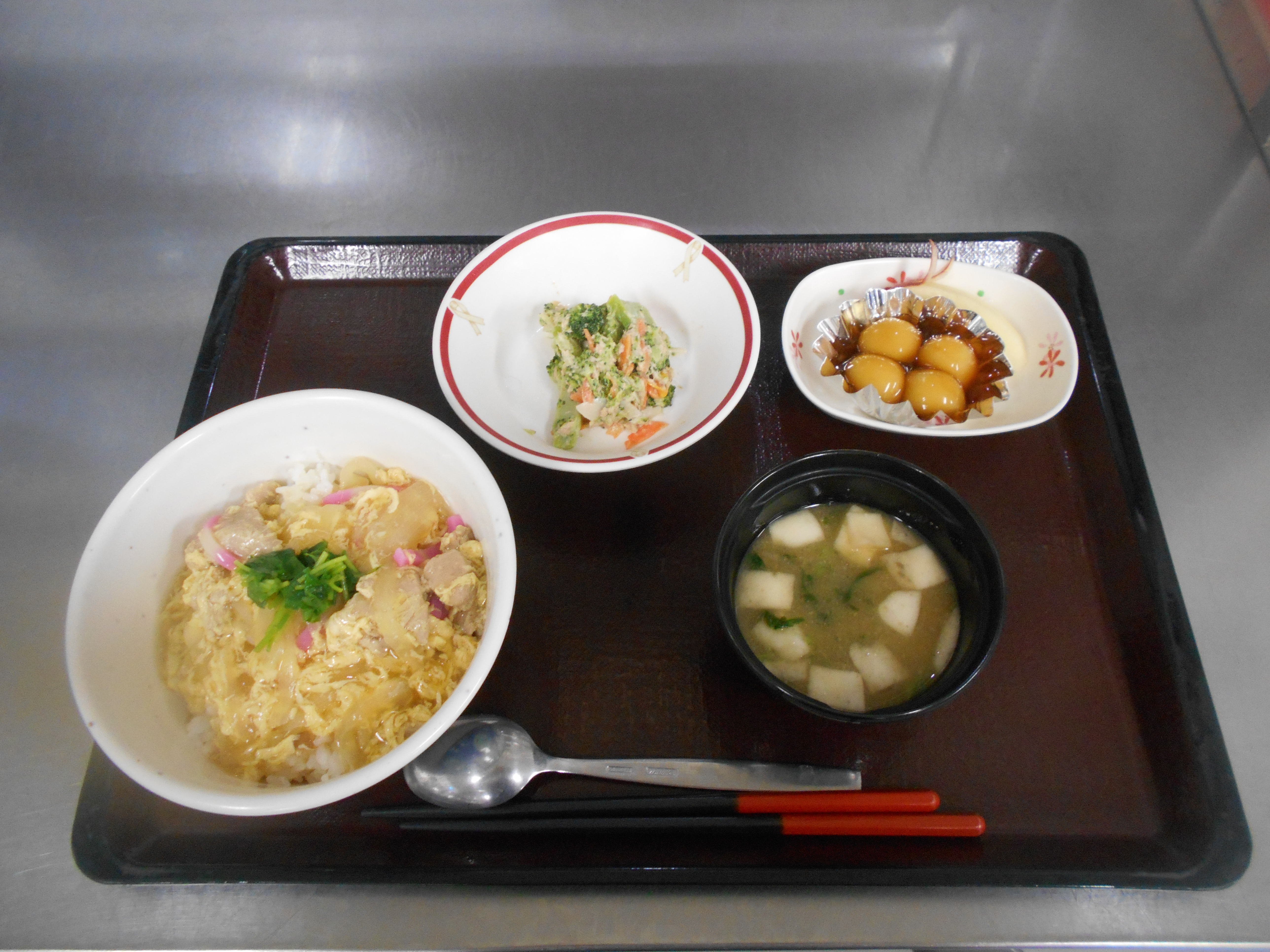 (献立)親子丼、ツナマヨ和え、赤出汁汁、みたらし団子&うさぎりんご