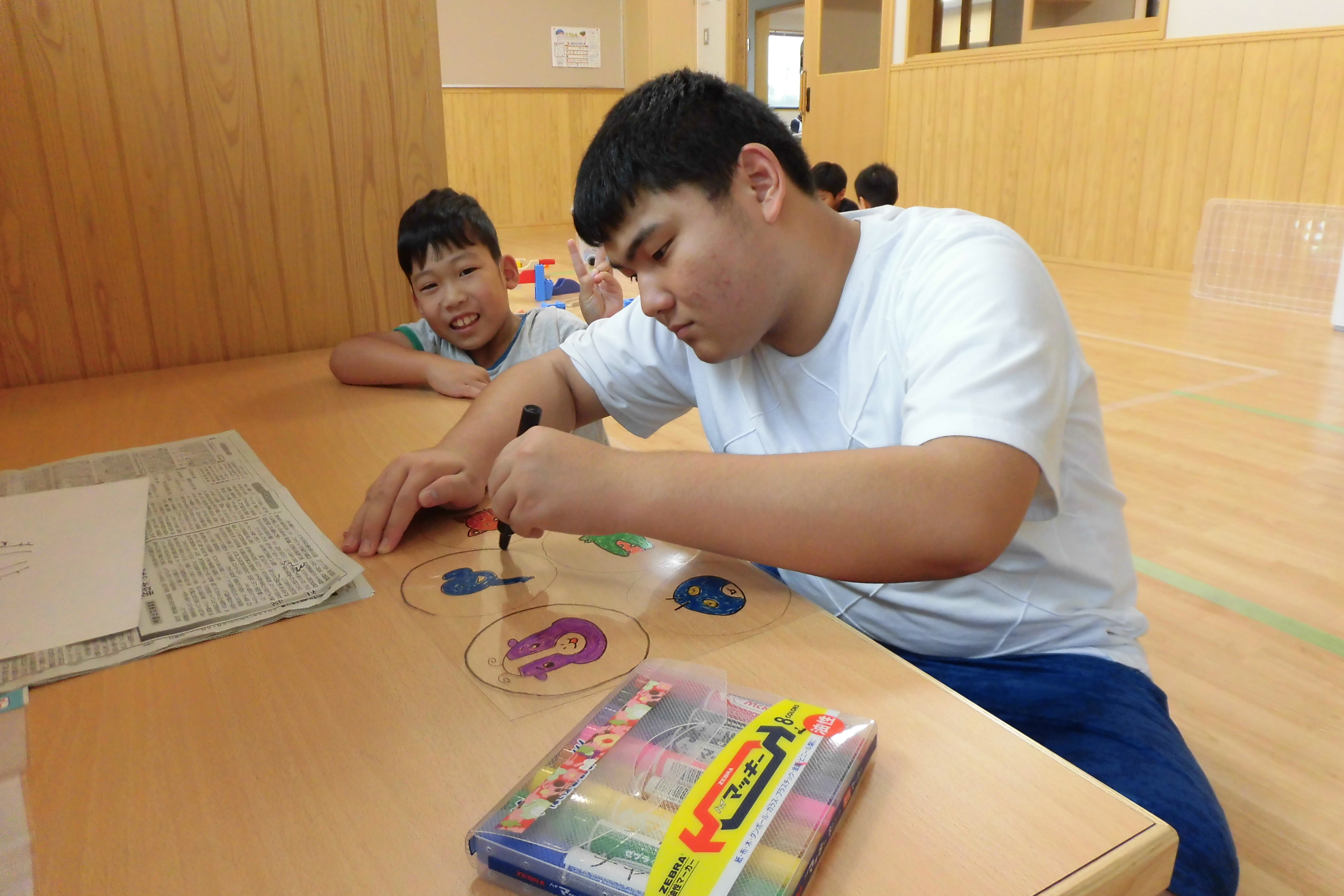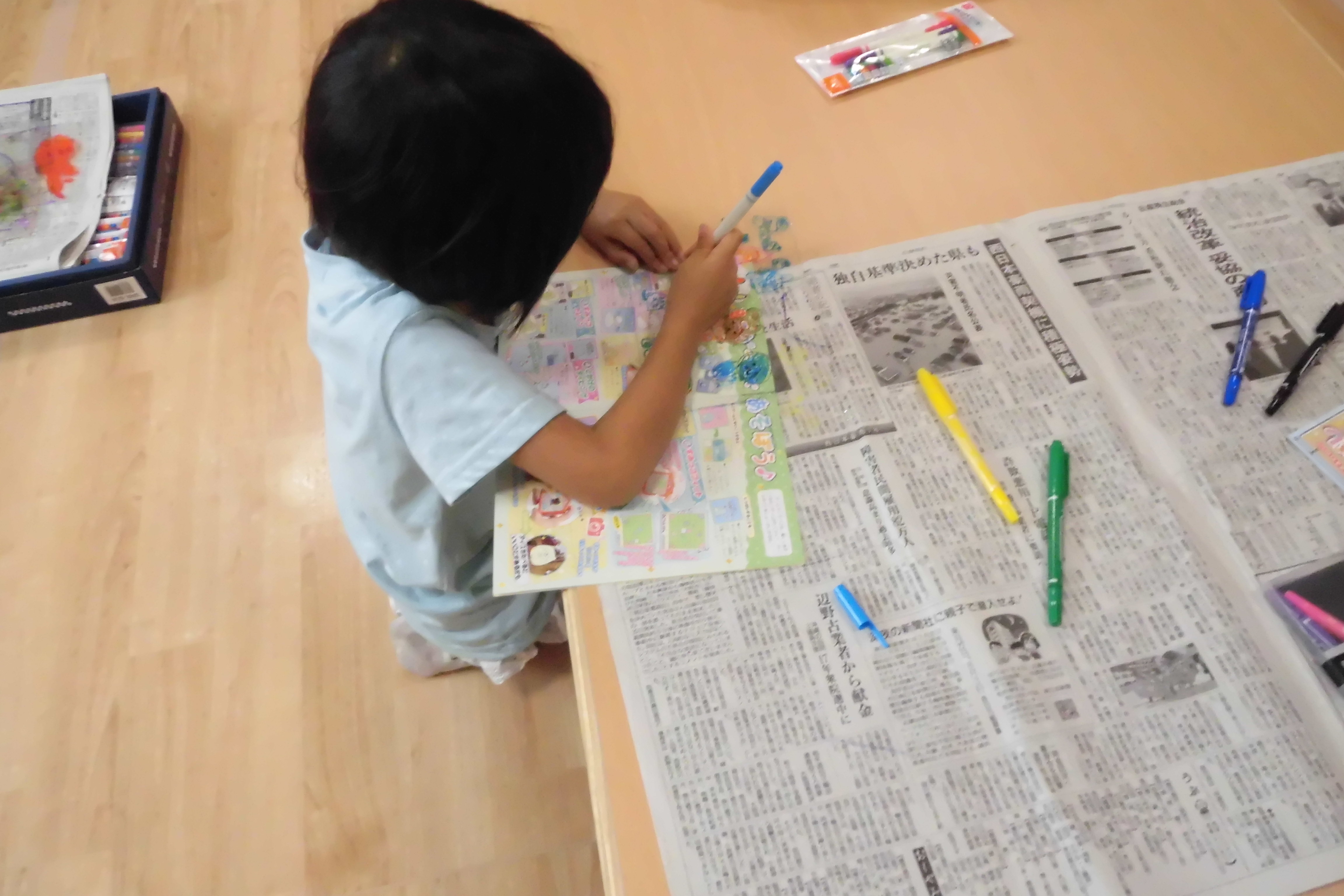 下絵、ペン、プラ版、はさみの用意から子供が参加し、写し絵→塗り絵→はさみで切るという過程に集中して取り組んでいました。