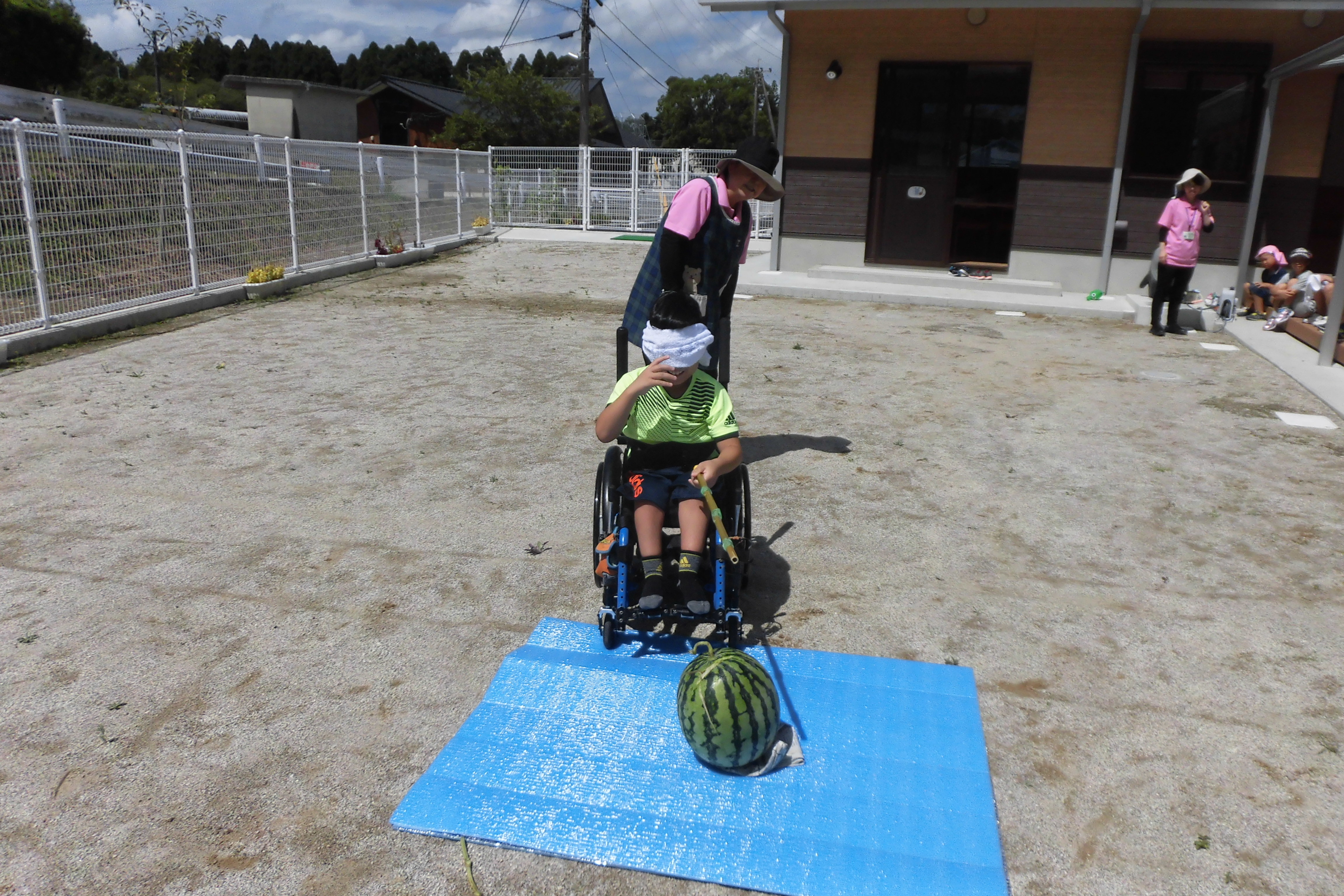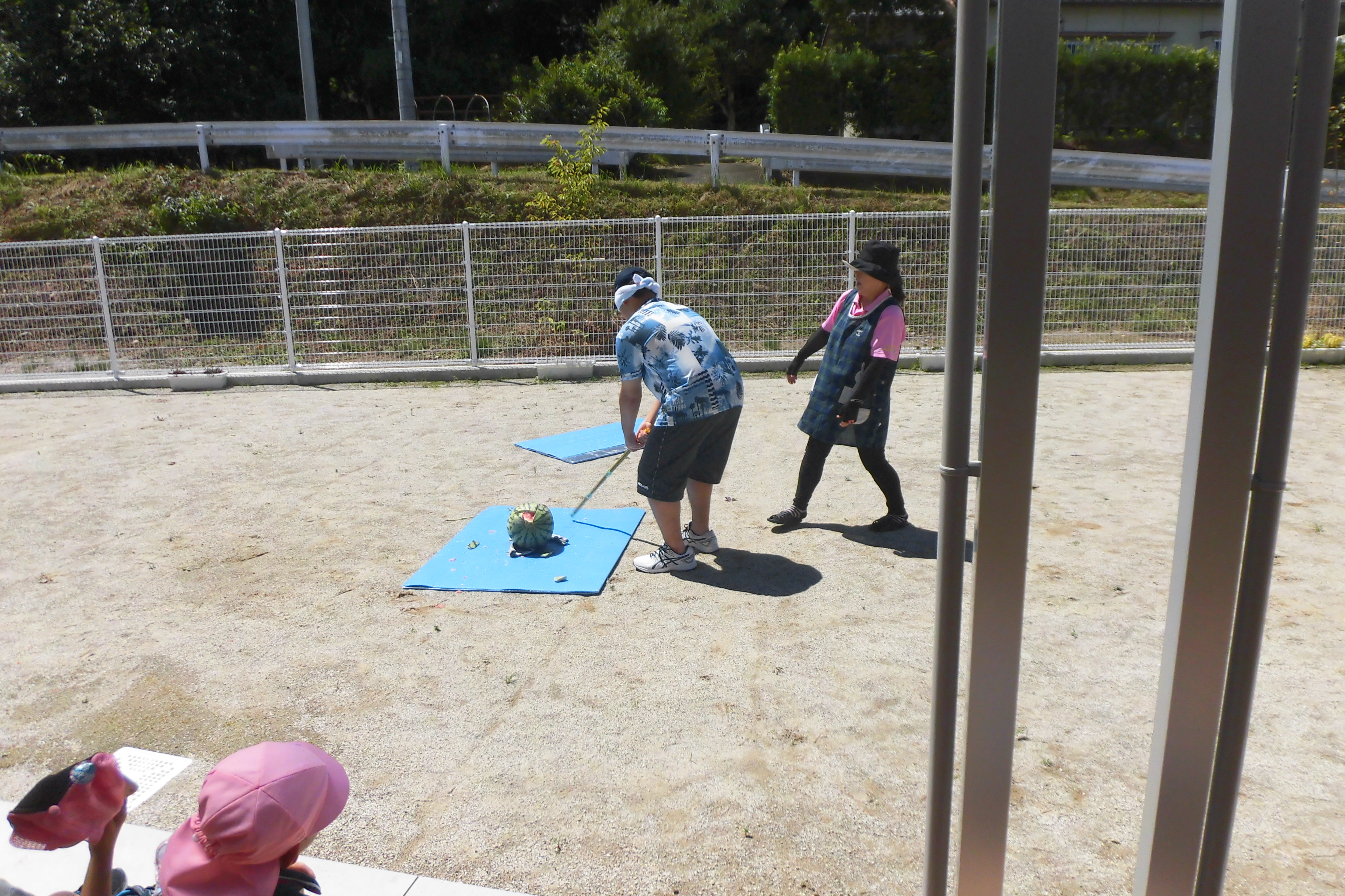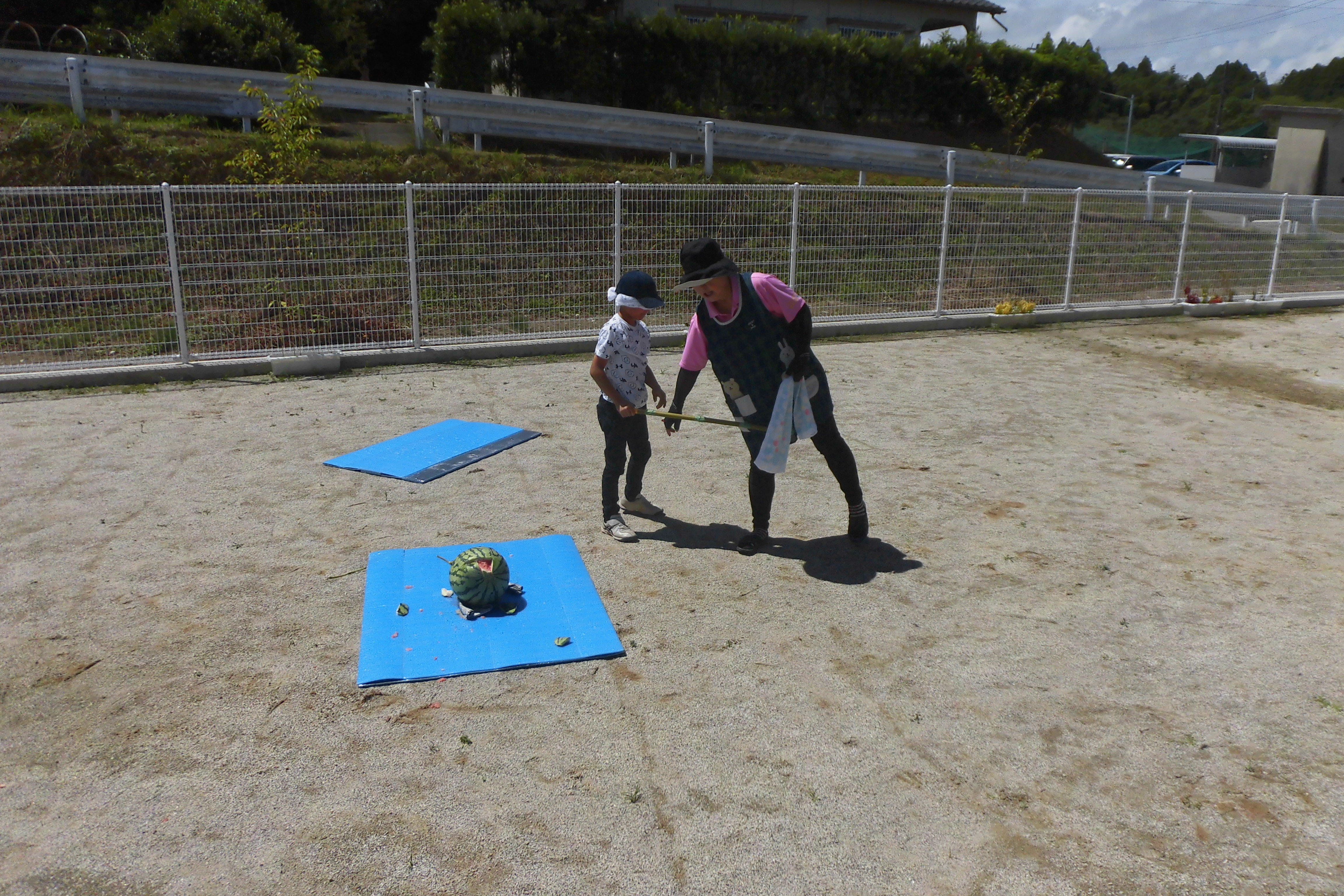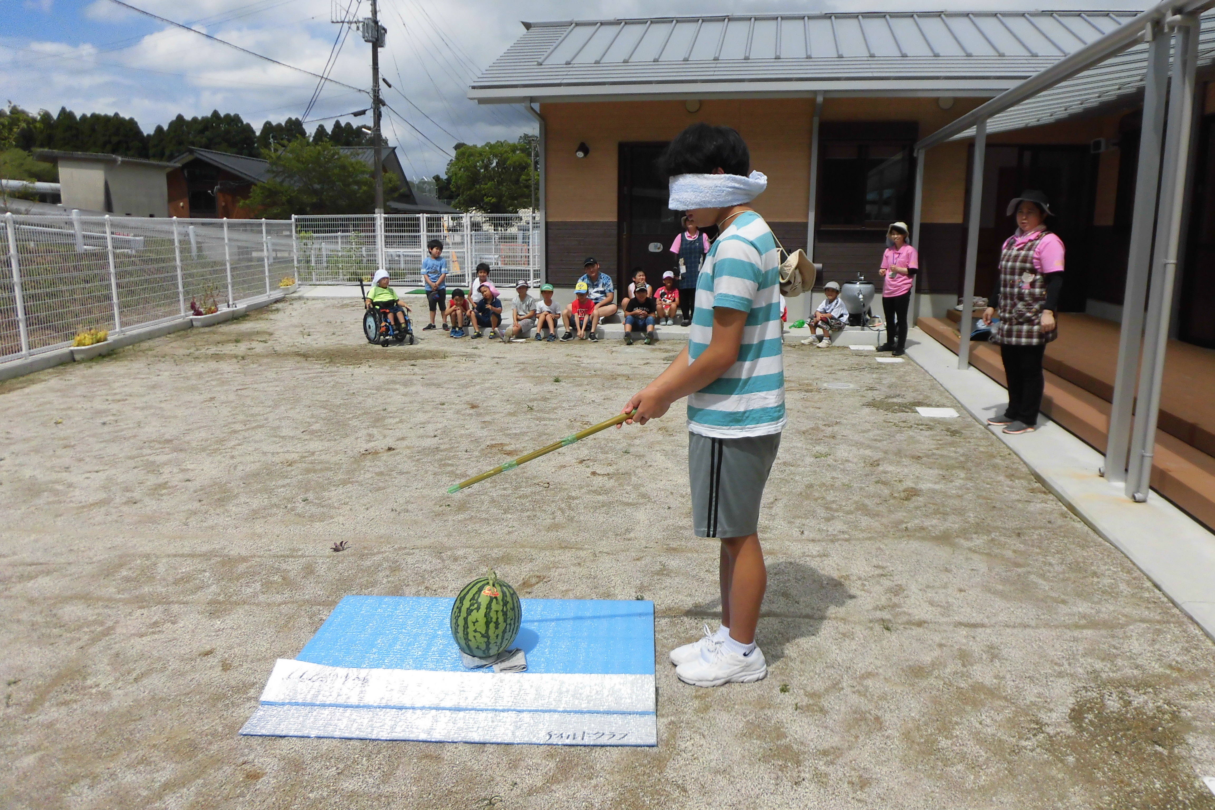 お天気にも恵まれ園庭で行うことができました。目隠しをして、お友達の「右だよ~!」「ちがう、左、左!」と周りの声を聴き、「エイッ!!」と元気よくスイカめがけて棒を振りおろし、見事にスイカを割っていました。目隠しをすることで一人ではできないことも、お友達の助けを受けてできる喜びを体験しました。
