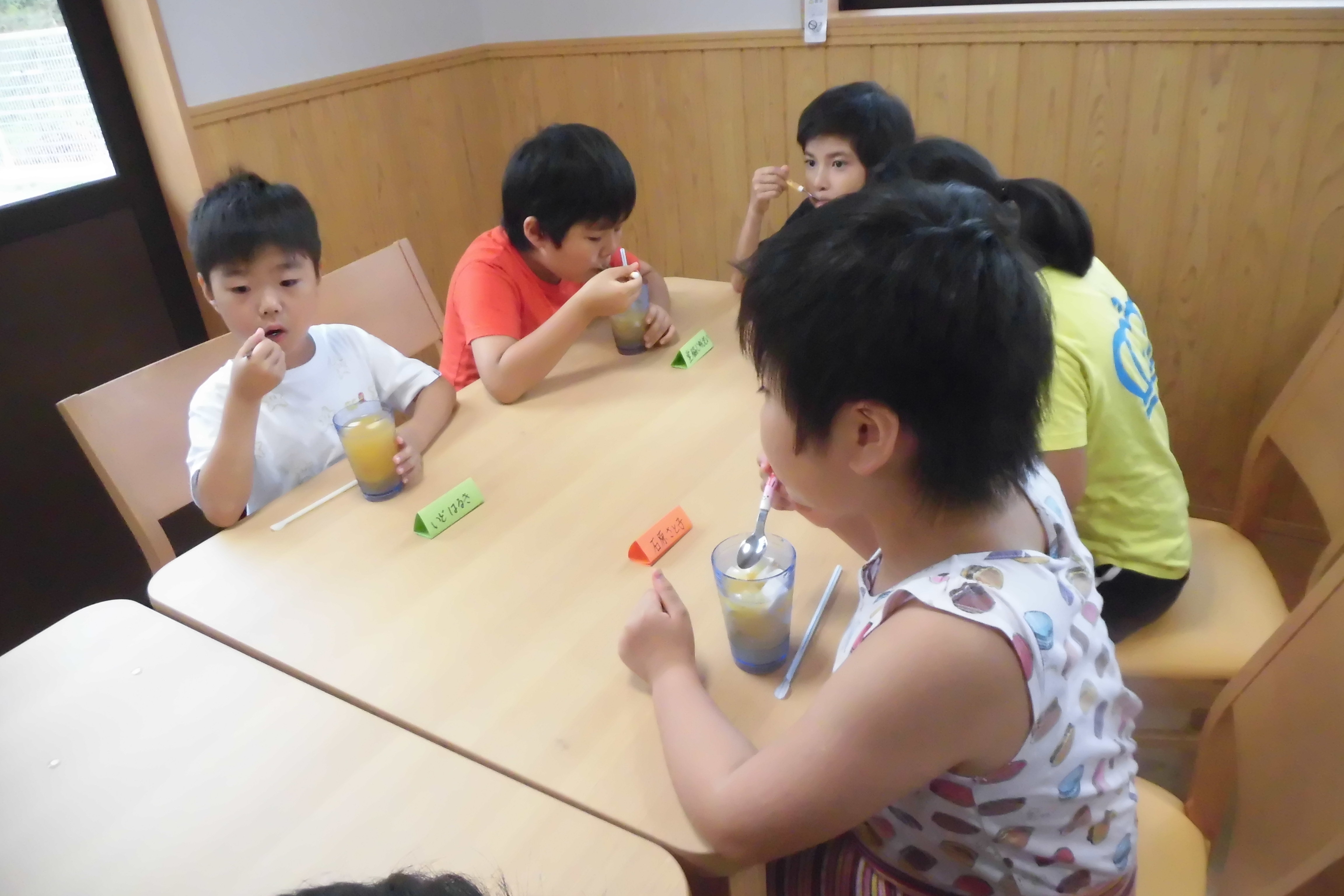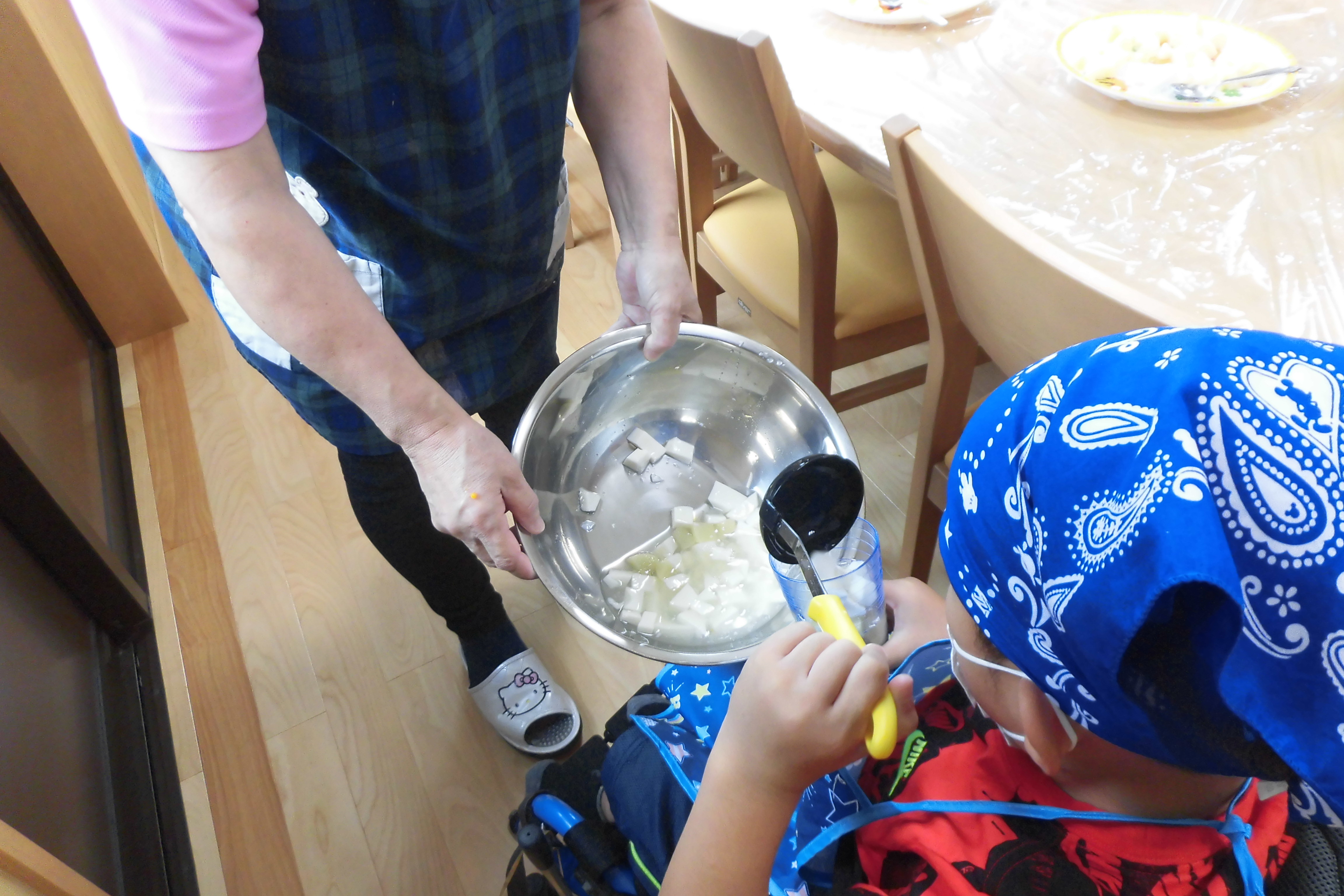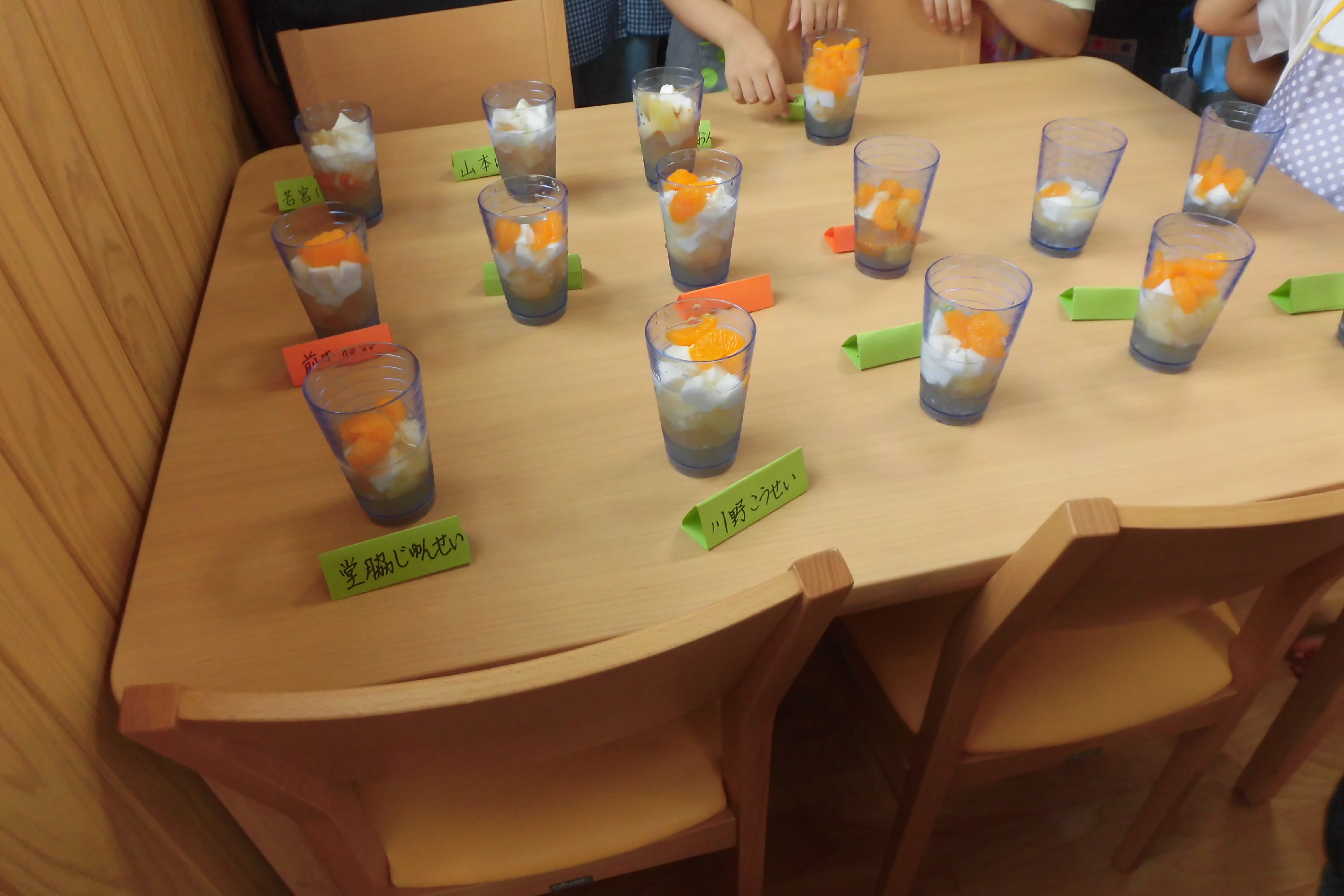 また、8月19日の午後からフルーツポンチ作りを行いました。カップに自分でお玉を使って、フルーツや寒天をこぼさないように気を付けながら盛り付けました。