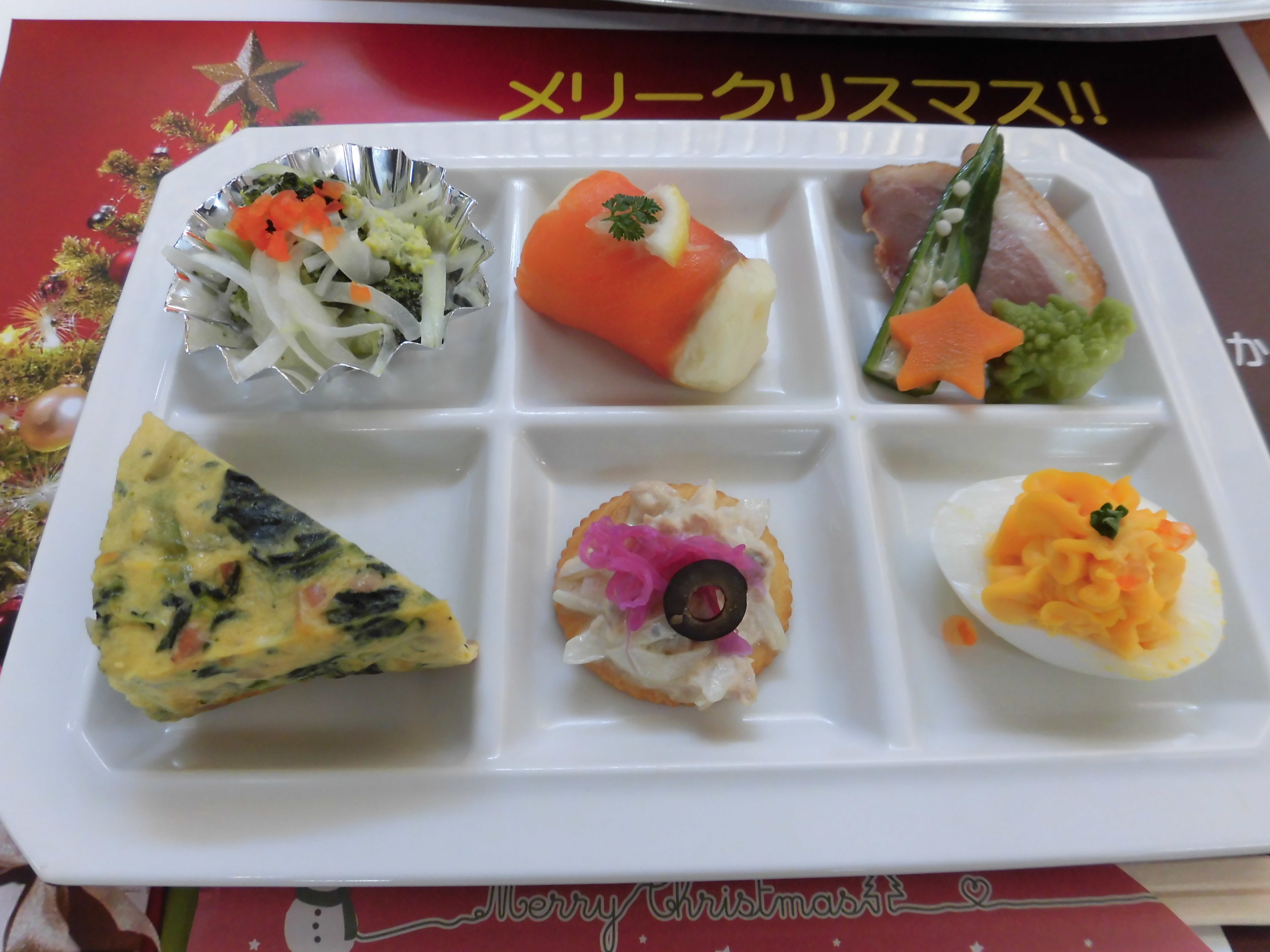 (献立)クリスマスピラフ、ミックスピザ、彩りプレート、オードブル、コーンポタージュスープ、