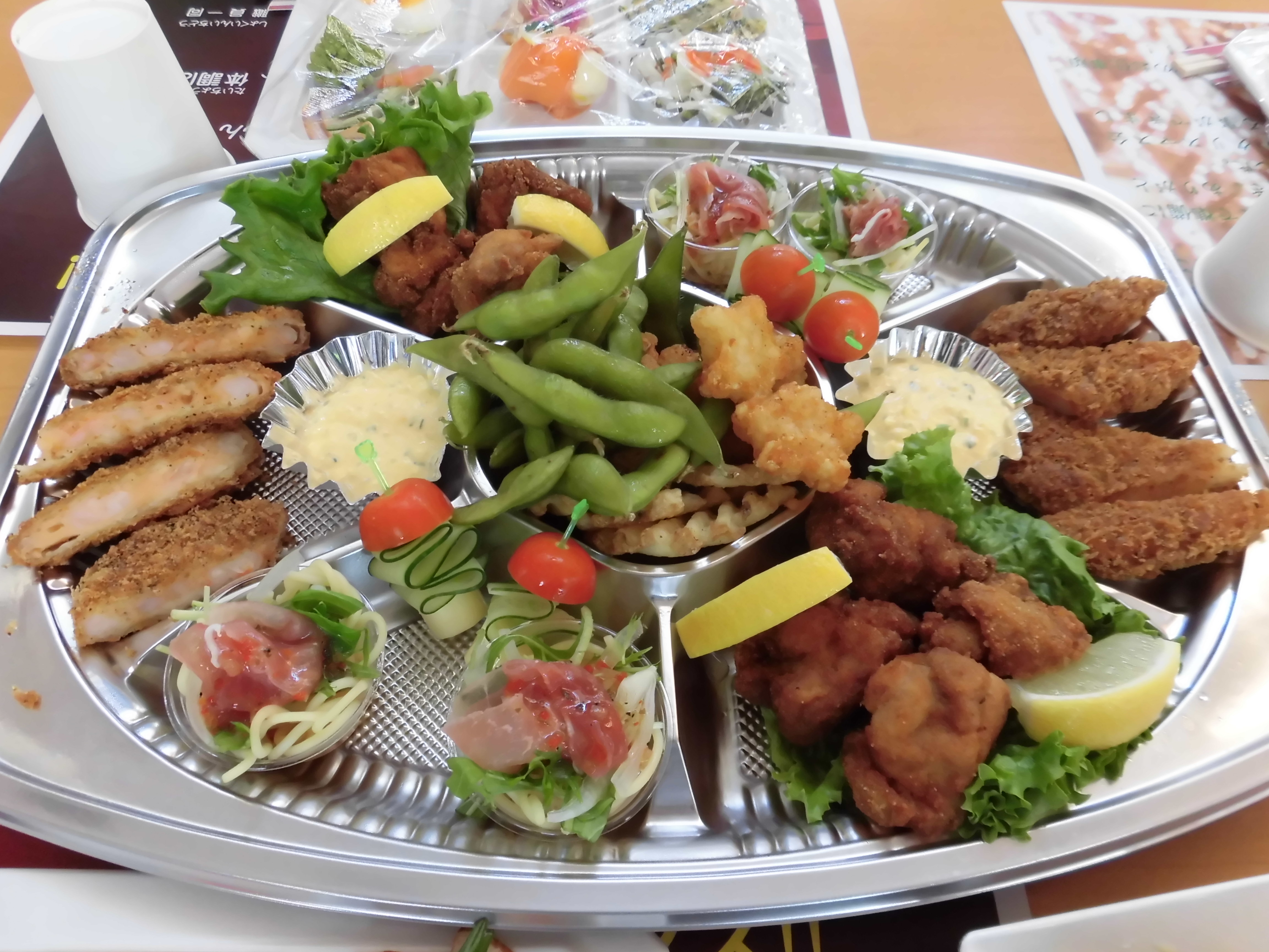 フライドチキン風唐揚げ、海老カツ、サラダパスタ、枝豆。フライドポテト2種