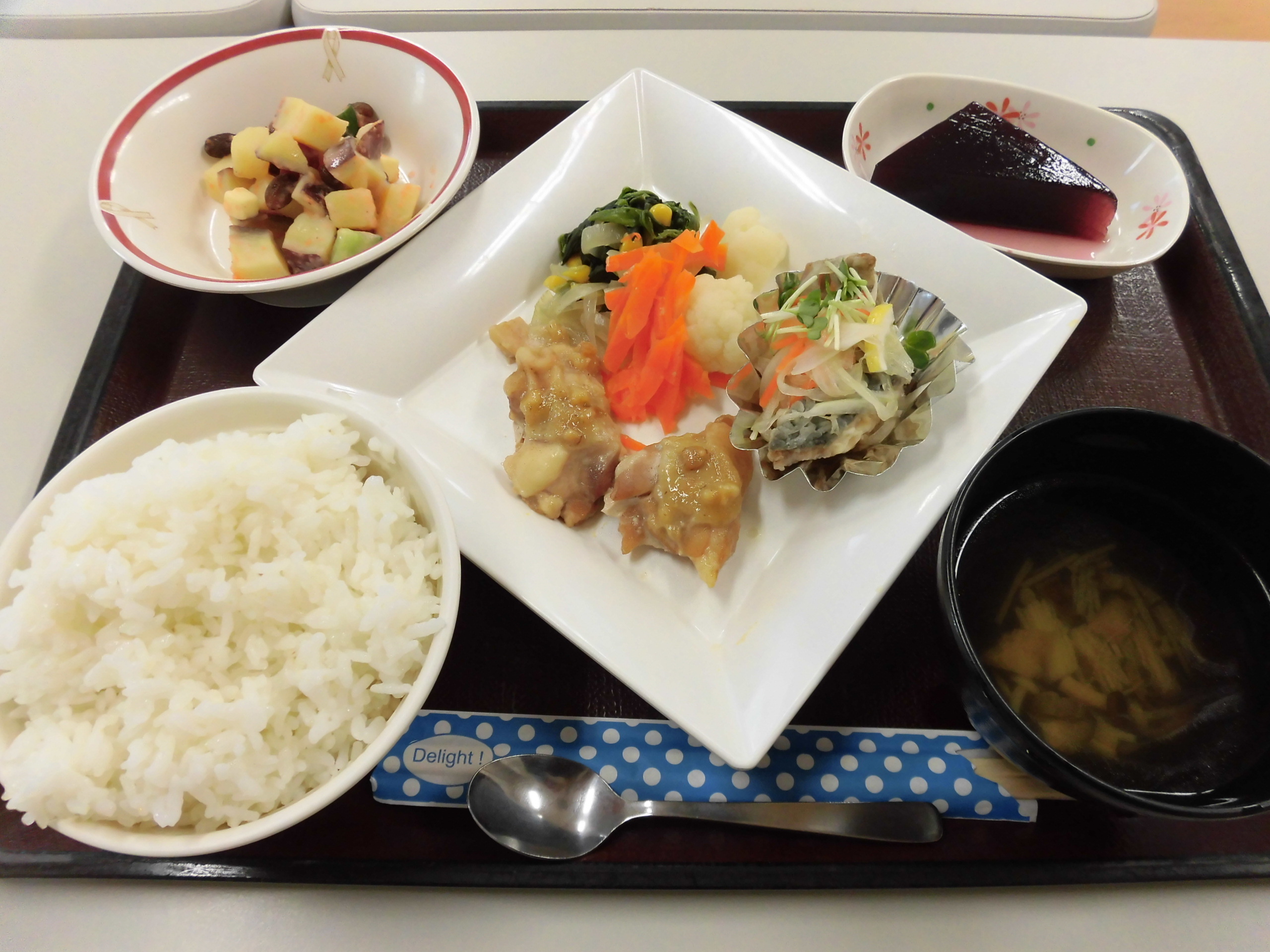 (献立)ご飯、コンビメニュー、さつま芋サラダ、きのこスープ、ぶどう寒天