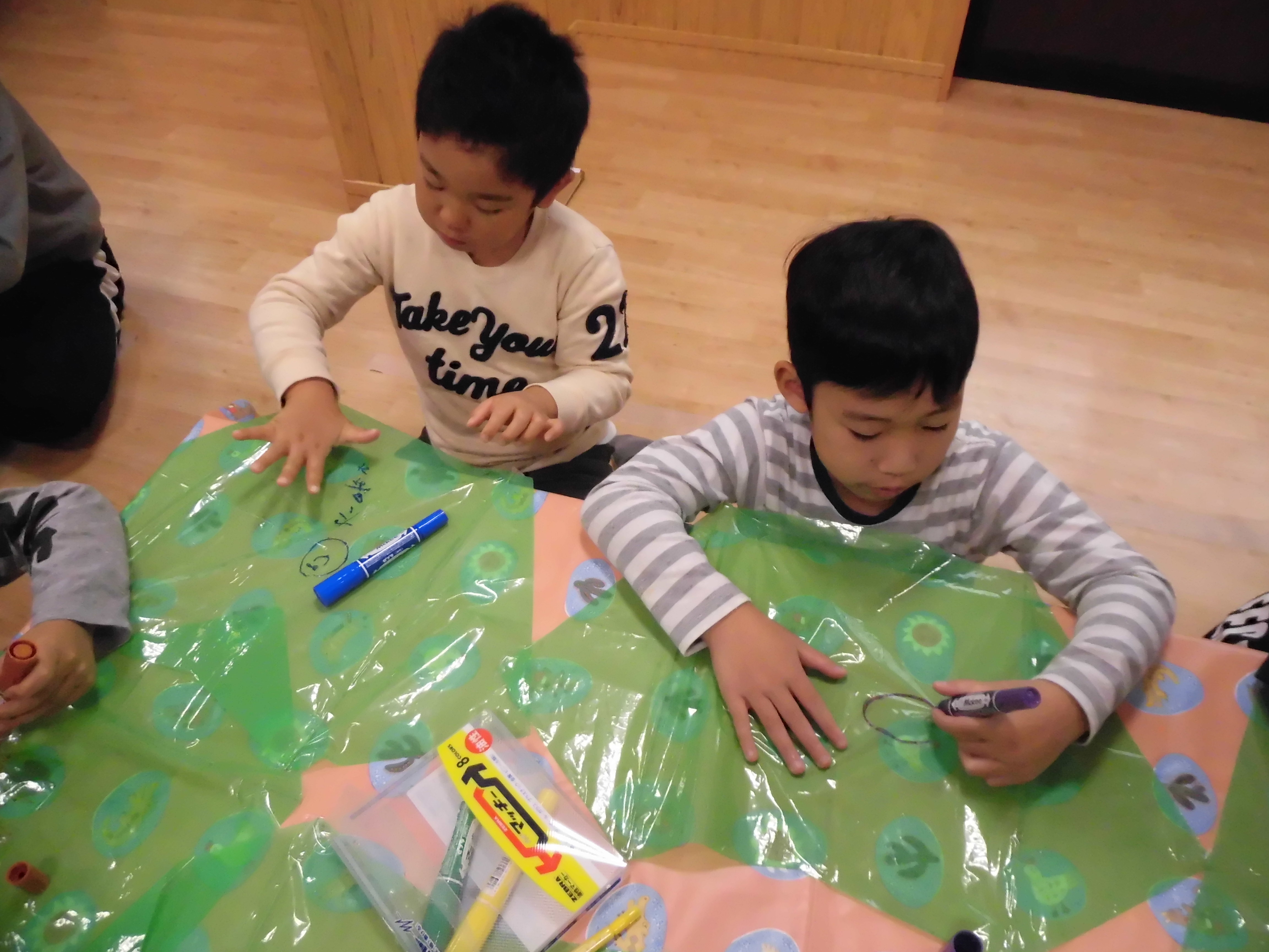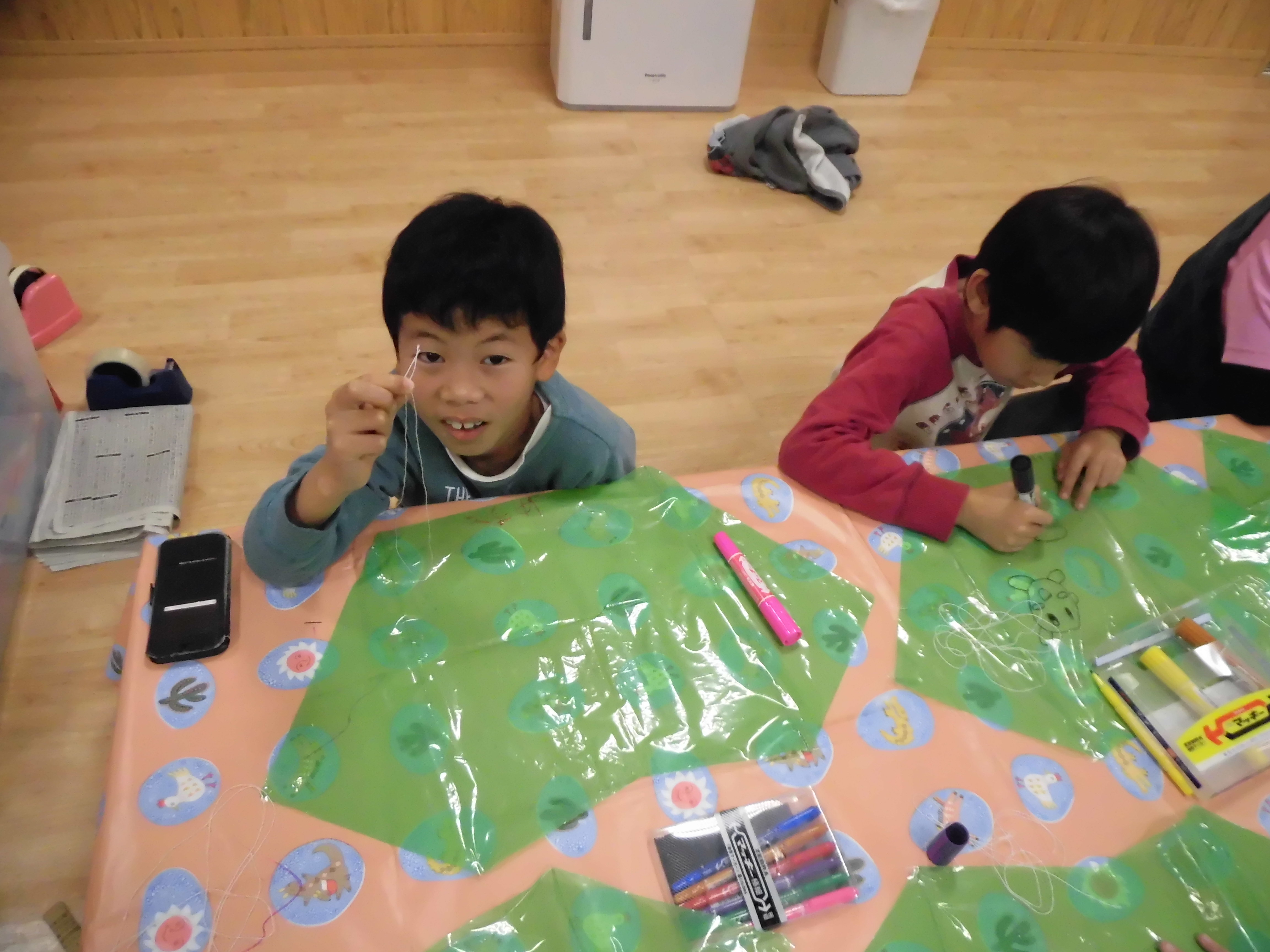 カラーポリ袋にテープで竹ひごを貼り、たこ糸のつなぎ方の説明を聞きながら作業を行い、最後に好きな絵を描いて完成させました。