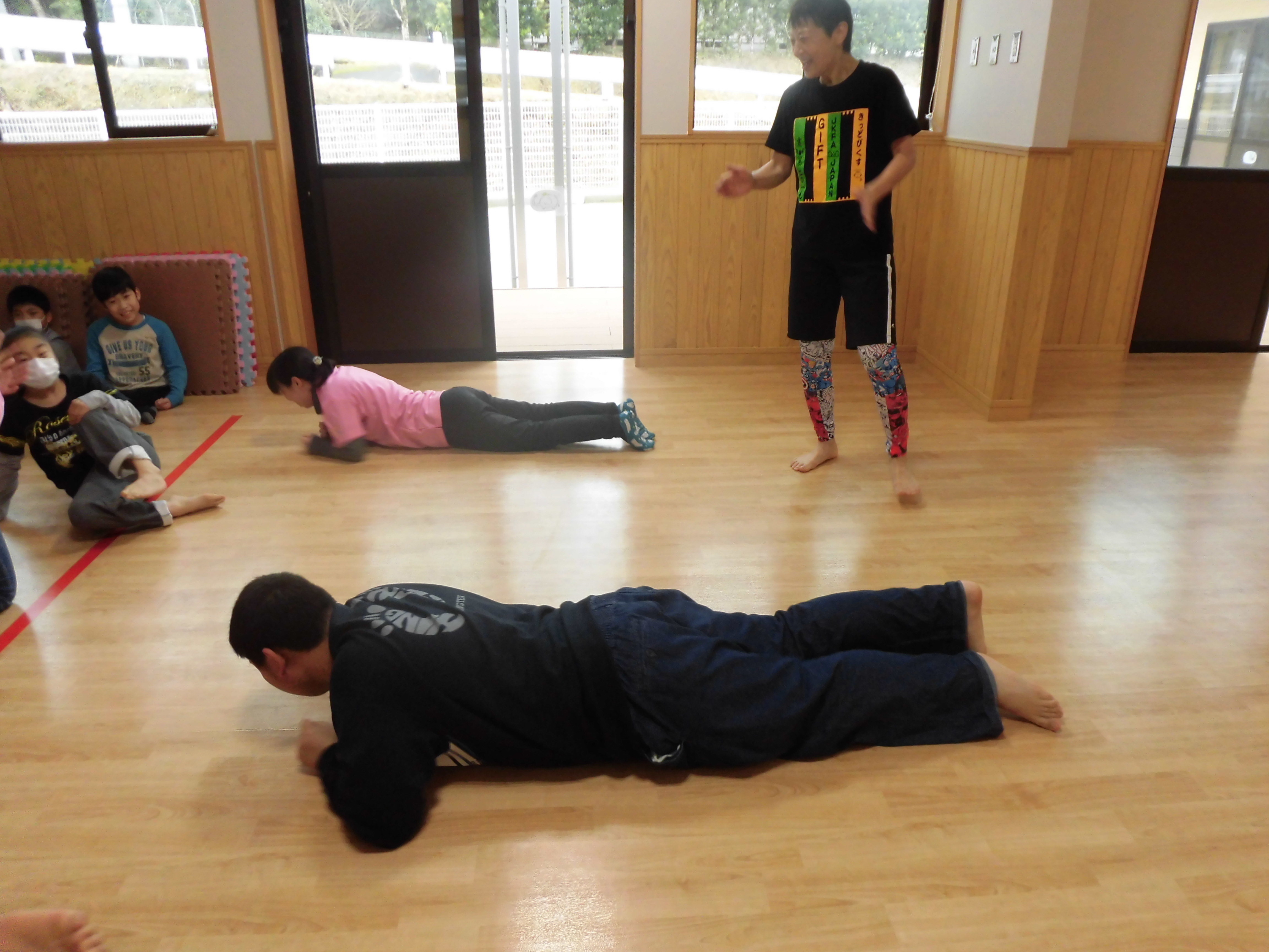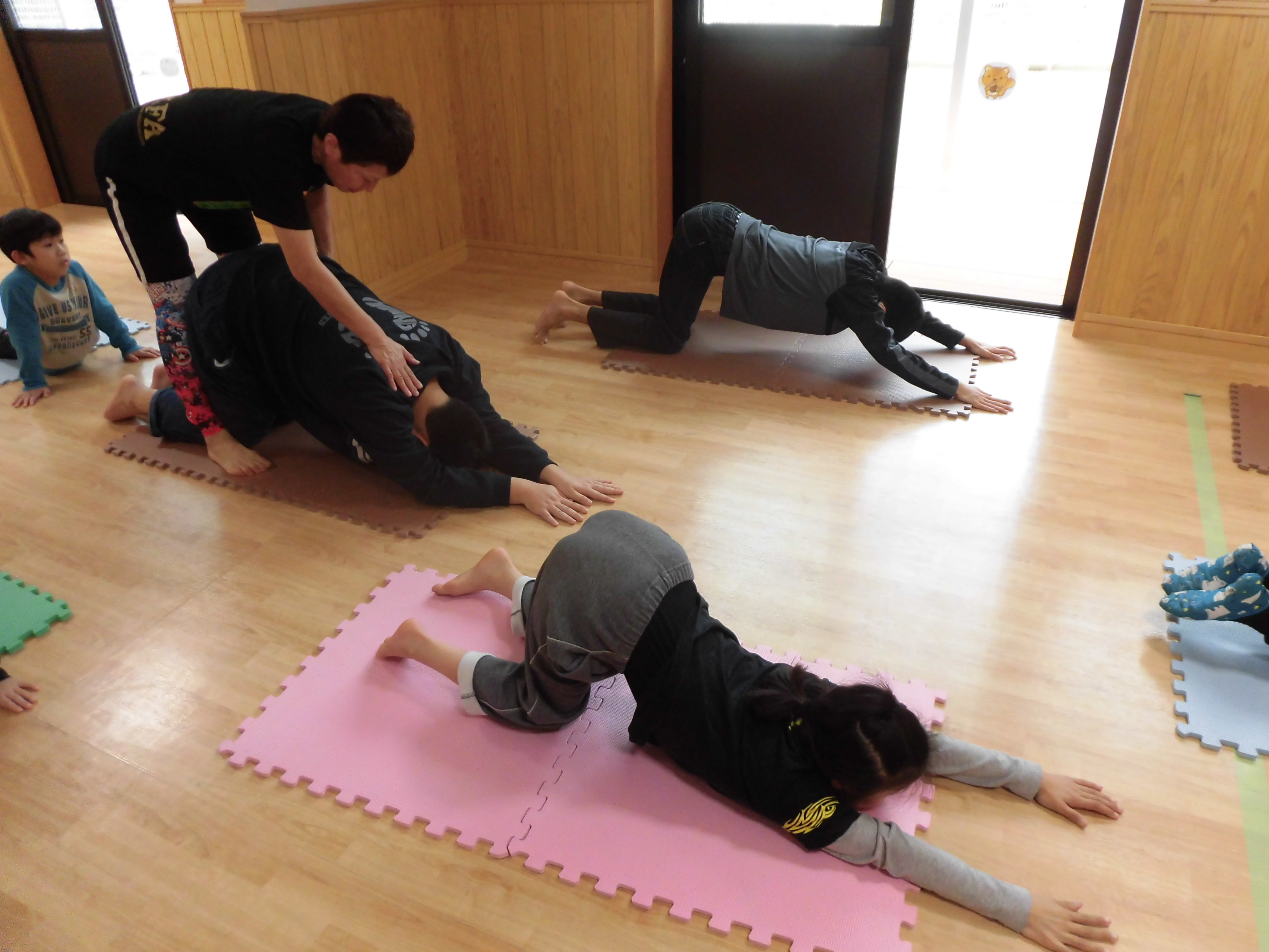 今回は、股関節と肩甲骨のストレッチ体操の指導を受けました。股関節は、体の中でも特に大切な関節です。柔らかく柔軟にする事で身体の踏ん張りがきき、転んでも怪我を防ぐ事ができるという説明を聞きました。子供たちは、先生の指示や、カウントする数を聞きながら身体を楽しく動かしていました。また、うつ伏せになり両腕を使っての移動をしました。先生より、「競争するのではなく、最後までしっかりと身体を動かし、ゴールする事が大切です」と、指導を受けました。