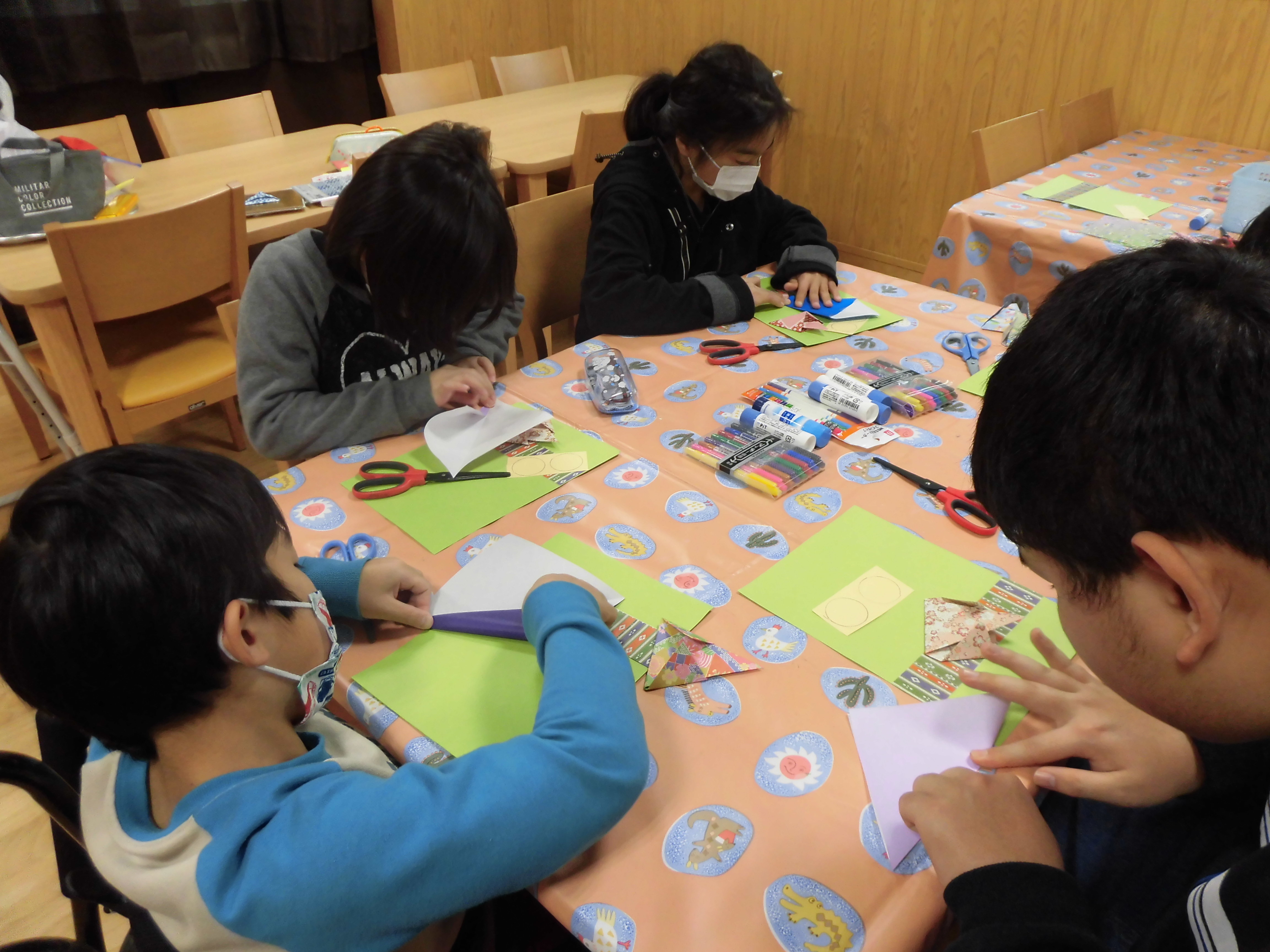お内裏様とお雛様を折り紙を使って、三角折りや線の中心に合わせしっかりと折る。折り紙を外側、内側に折る。また、顔の部分は、線に沿ってはさみで丸く切り取り、顔を描き仕上げました。折り紙を折るときの方向の認知や、はさみを使って切る手指訓練を支援員の説明を聞きながら行いました。折り紙の折る順番が分からなくなると、「手伝ってあげる。こうするんだよ。」と、手伝ってもらい、「ありがとう。」と、お友達同士会話をしながら楽しく制作に取り組んでいました。