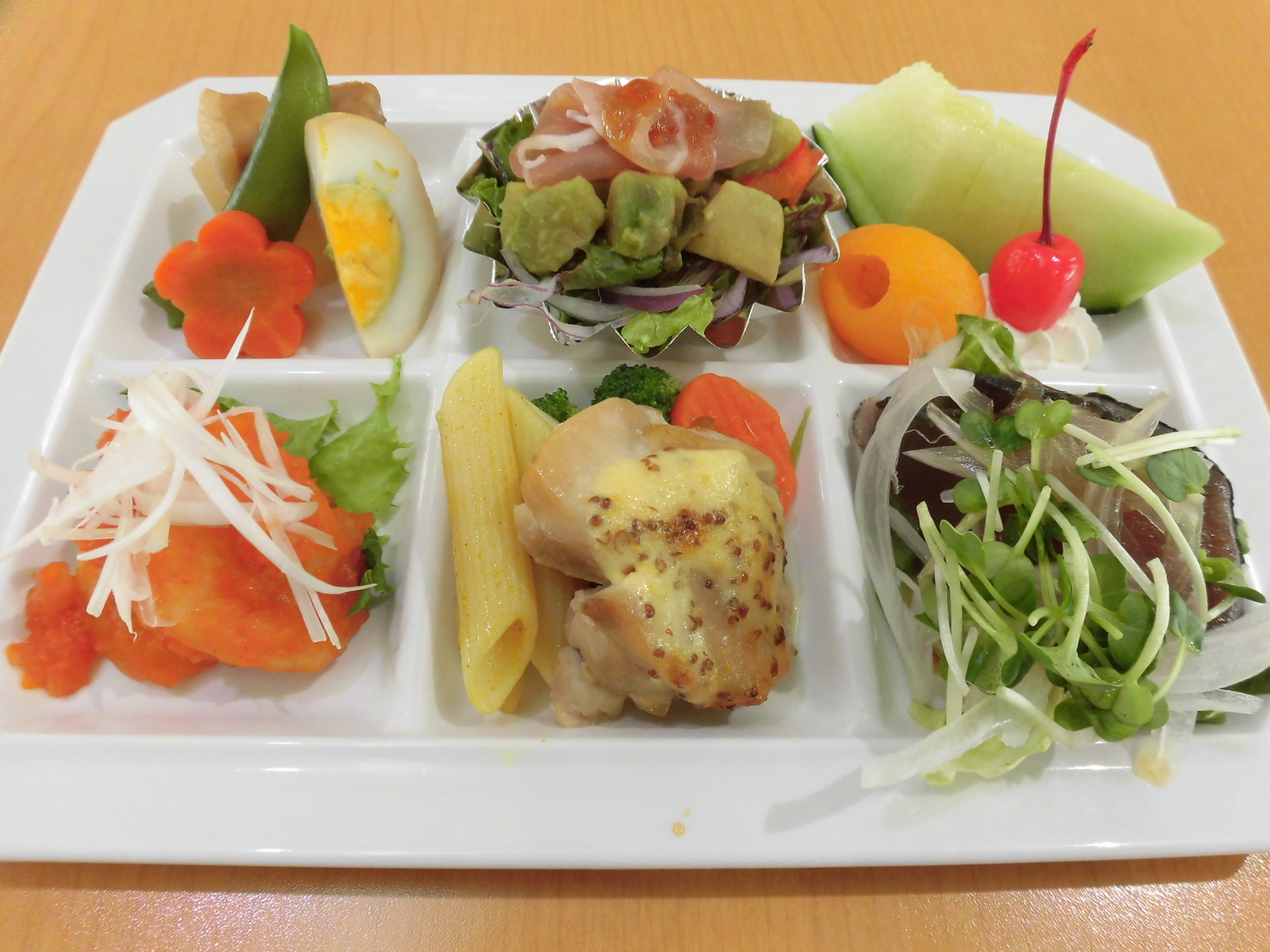 (左奥より順に)豚の角煮、生ハムサラダ、フルーツ盛り合わせ