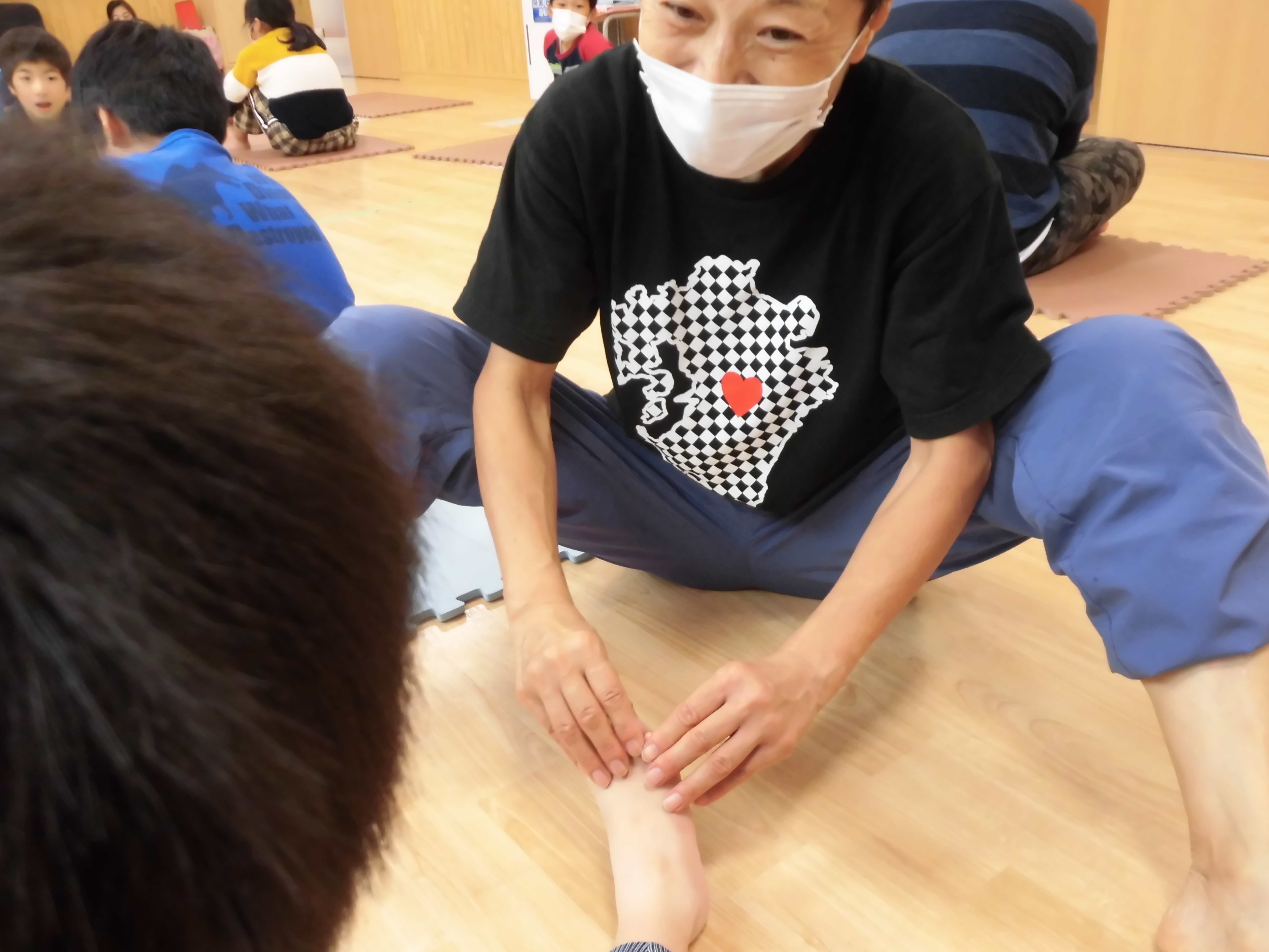 足裏のマッサージの指導を受けました。足の指を広げたり、足裏をマッサージすることで体のバランスがとりやすくなり、安定した歩き方、外反母趾の予防にもなる事など、児童一人ひとりにわかりやすく説明をしてくださいました。