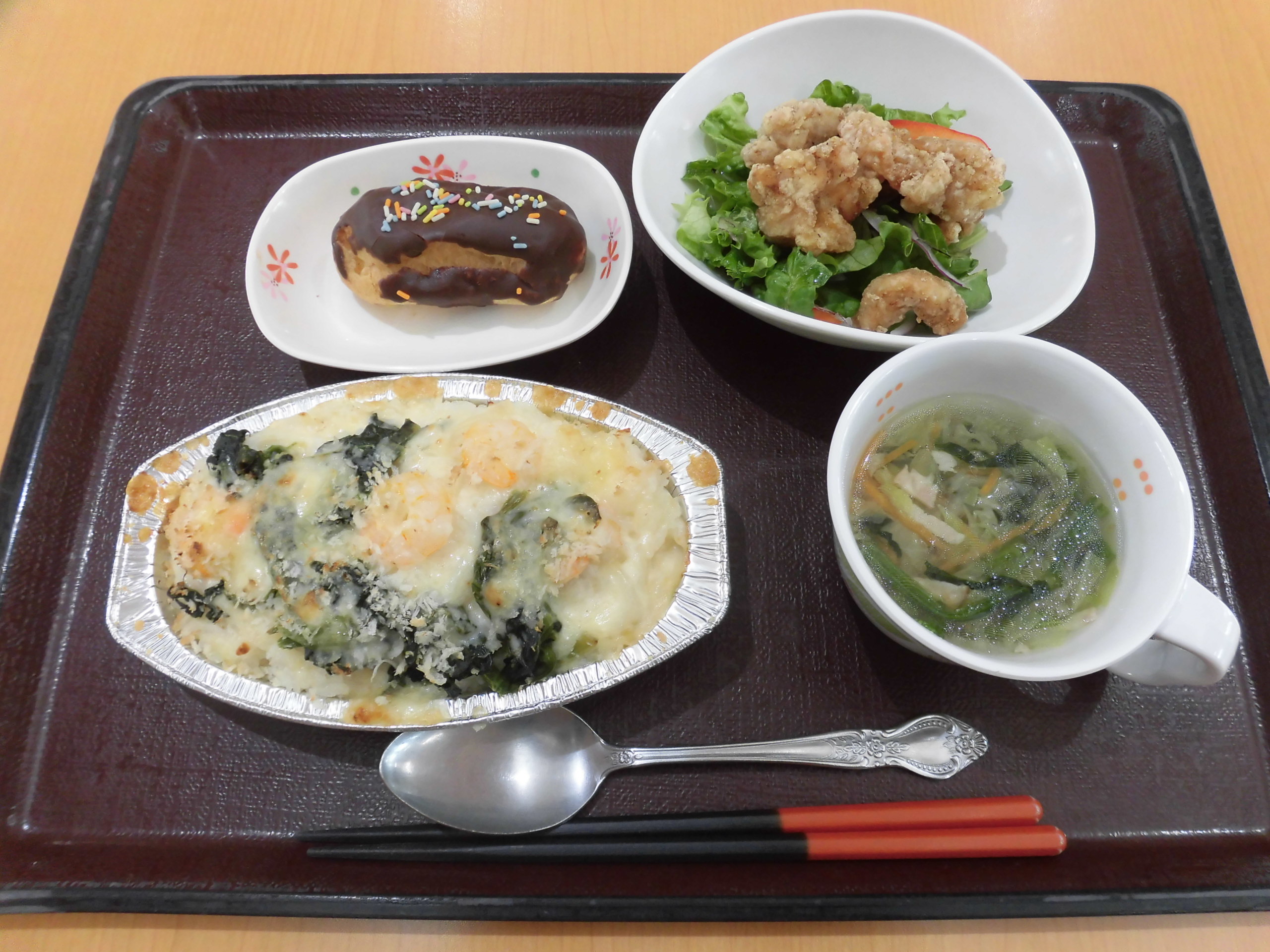 (共通メニュー)唐揚げサラダ、野菜スープ、エクレア