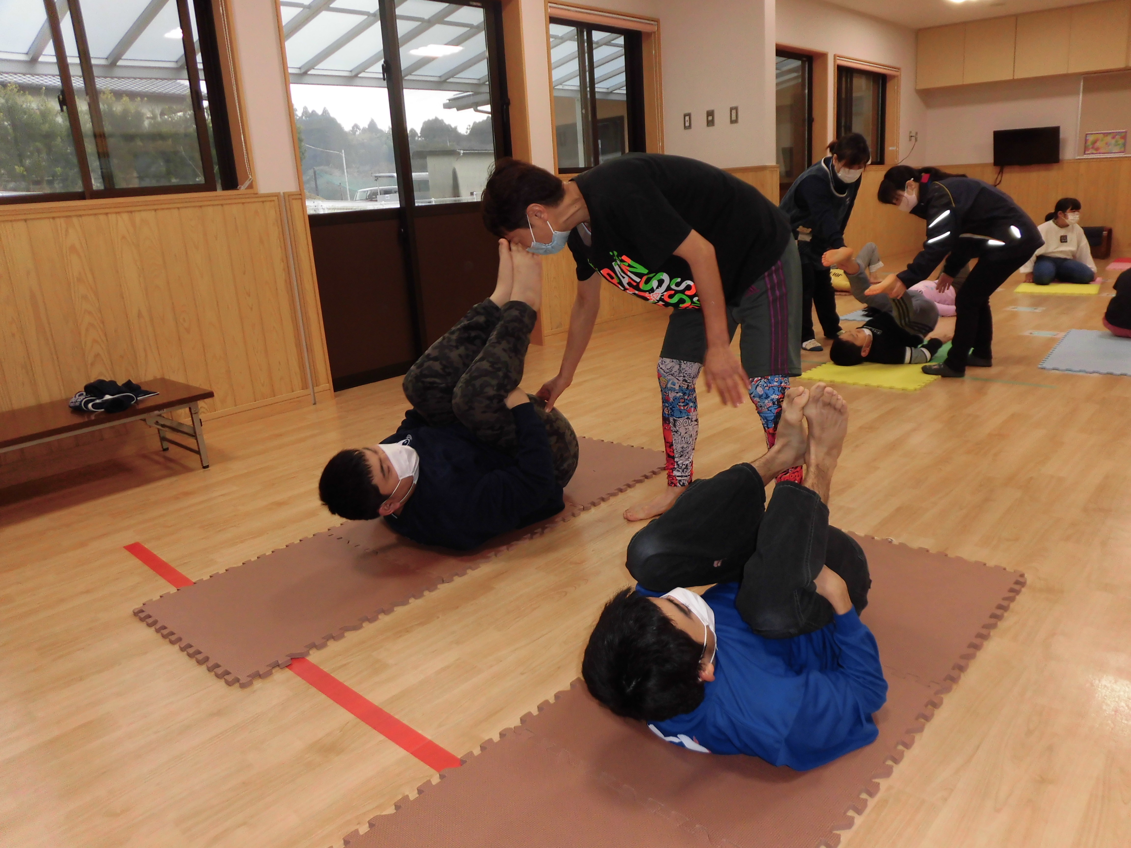 マット運動では、固くなっている体の筋肉を引き延ばすストレッチを行いました。また、四元先生より一人ずつ体のバランスや固さを確認した後、その児童にあったストレッチの指導を受けました。