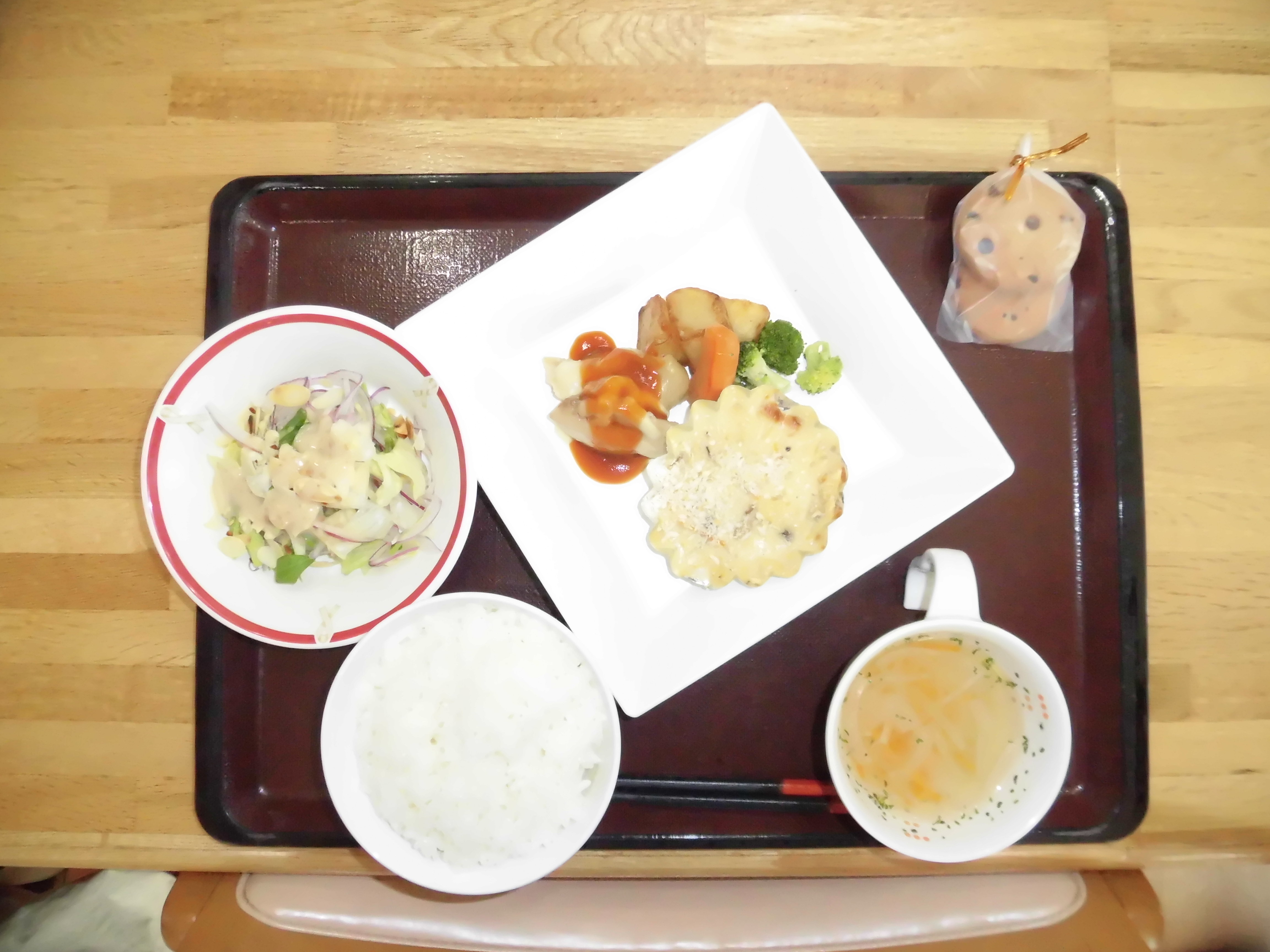 (献立)ご飯、チキンチーズ焼き&ミニグラタン、アーモンドサラダ、