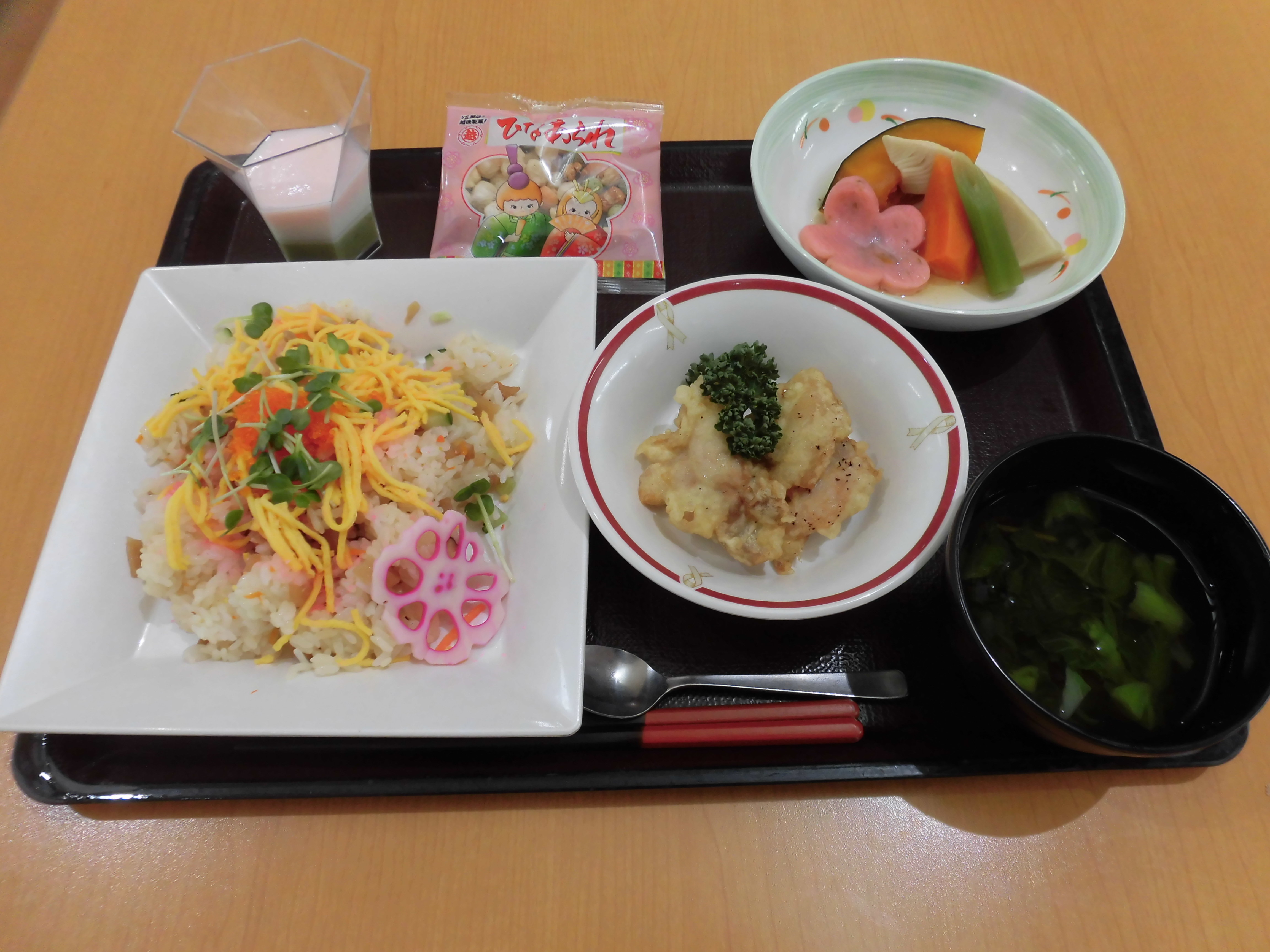 (献立)散らし寿司、鶏天、炊き合わせ、菜の花のお吸い物、三色寒天、ひなあられ