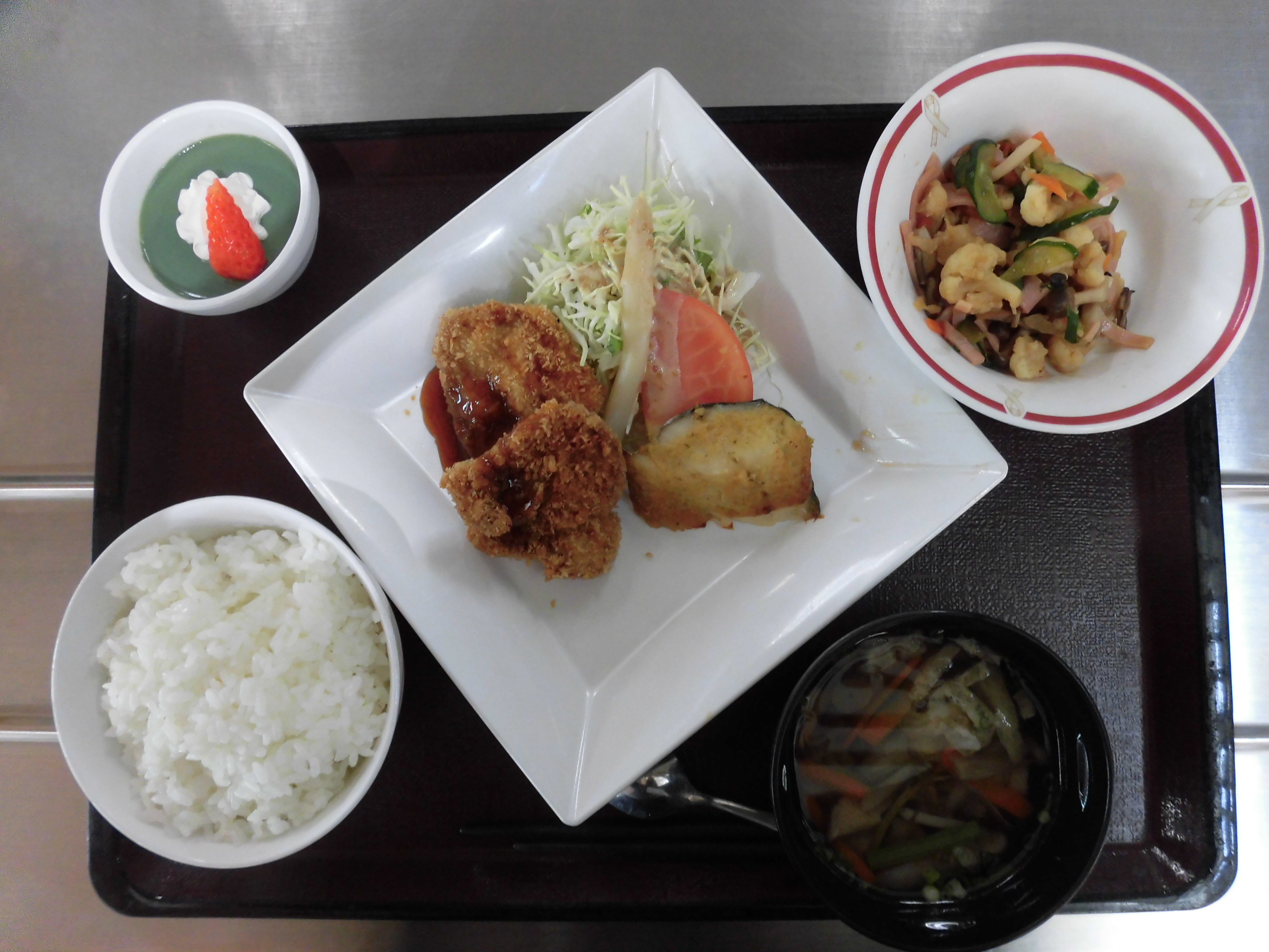 (献立)ご飯、コンビメニュー、カリフラワーの辛子和え、きこり汁、抹茶プリン