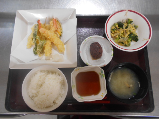 (献立)ご飯、天ぷら、菜種和え、あさり汁、おはぎ