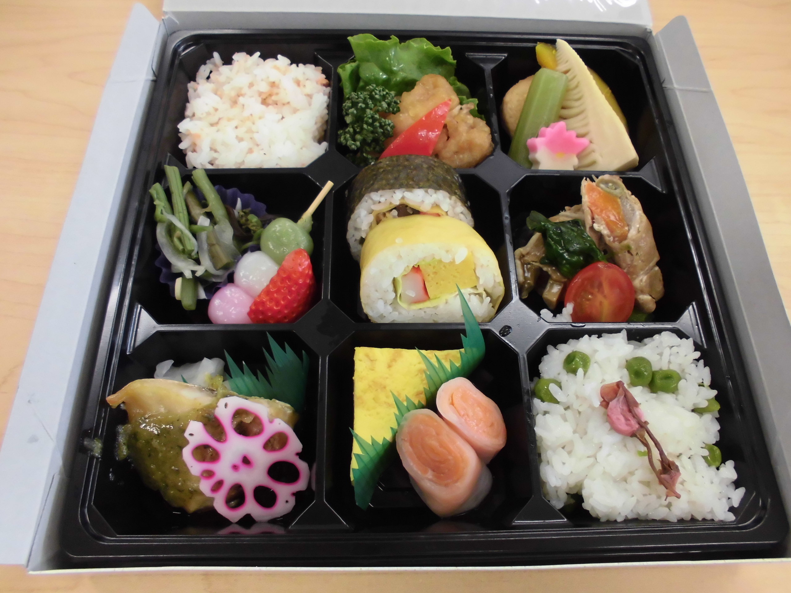 お弁当は多種多彩で、蓋を開けてビックリ、食べて満足の内容でした。