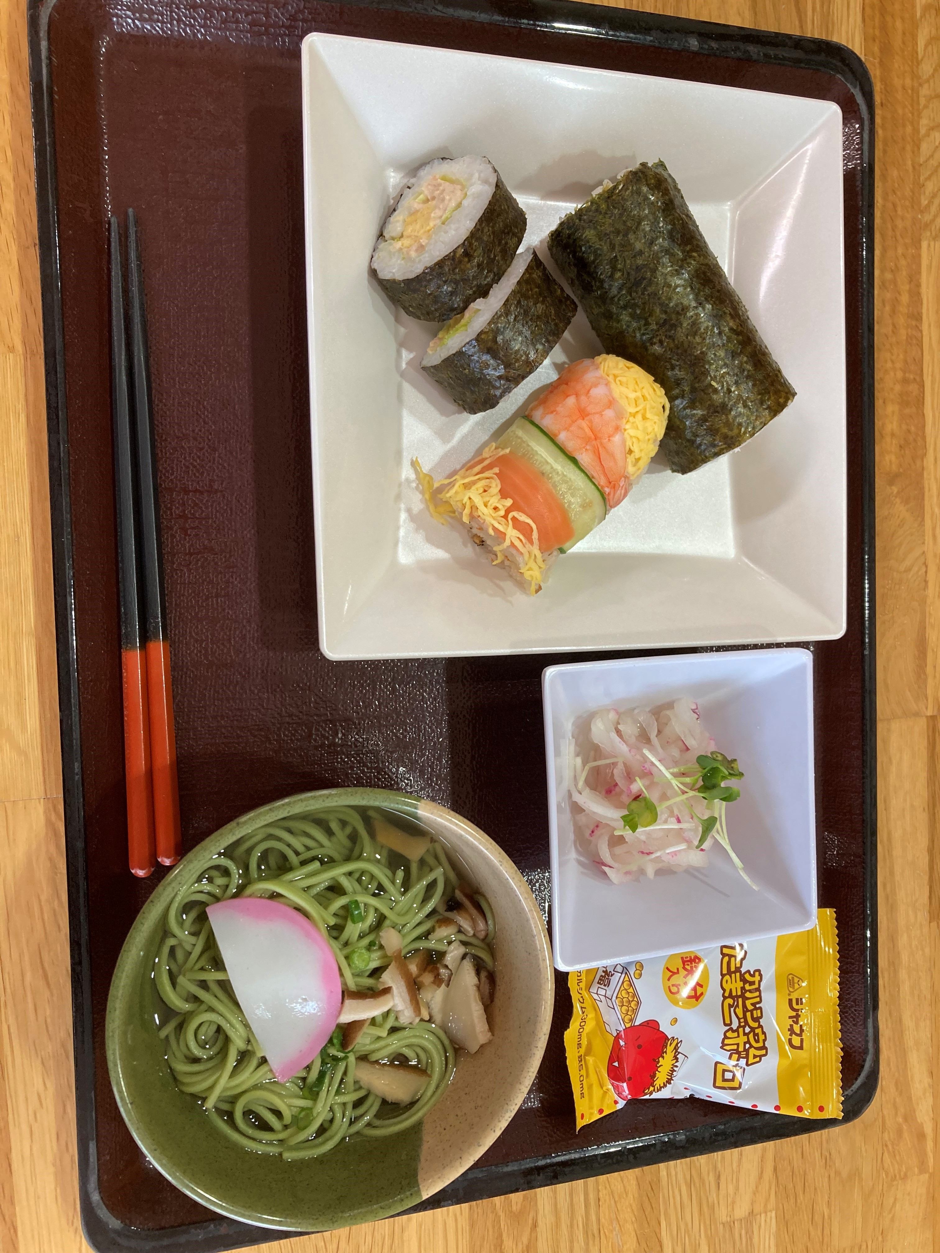 (献立)恵方巻き、レタス巻き&ロール散らし、赤大根の酢の物、茶そば汁、節分ボーロボーロ