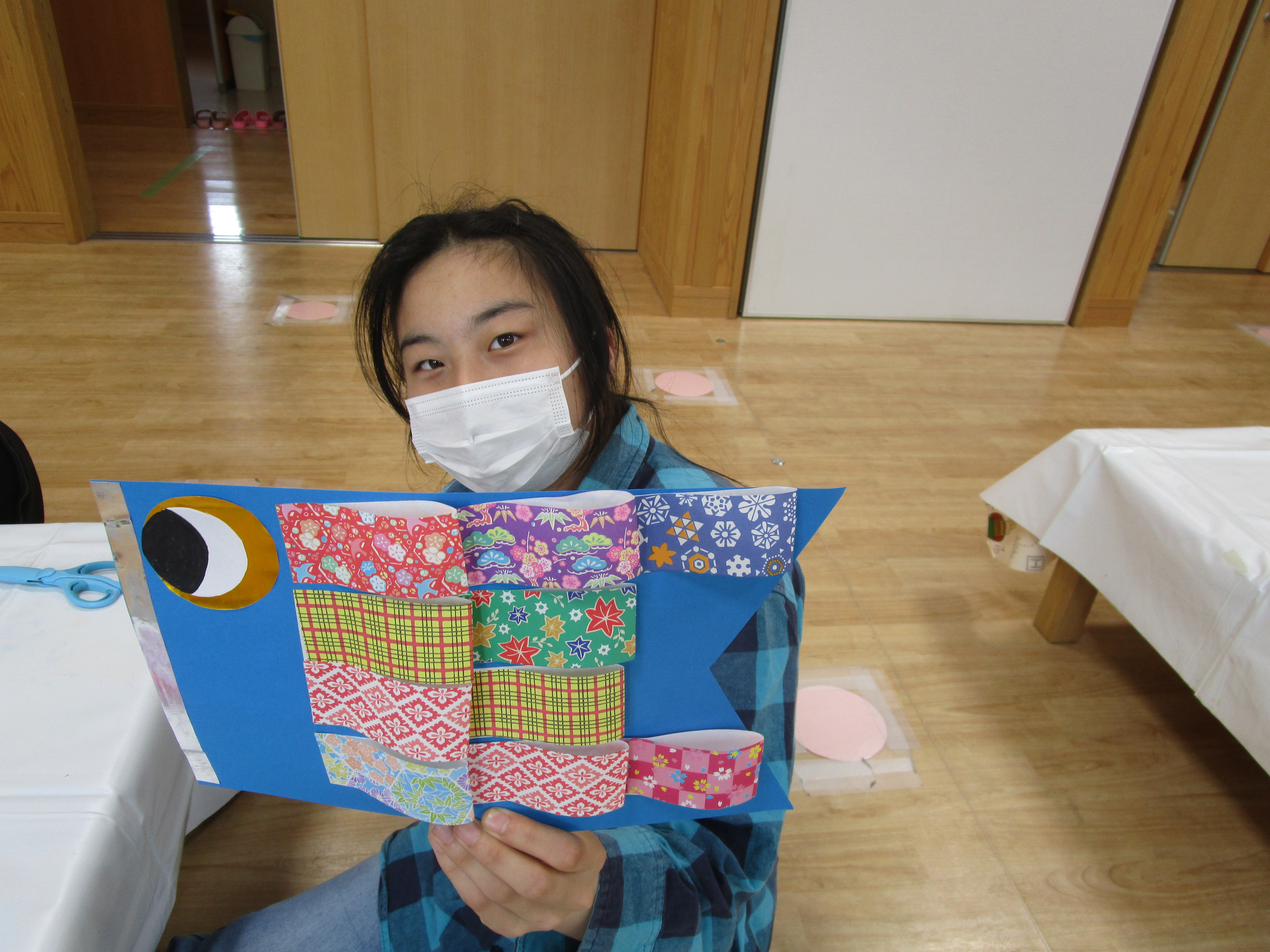 千代紙を使ってこいのぼりの鱗を作り、一人ひとり個性豊かな作品を作成しました。