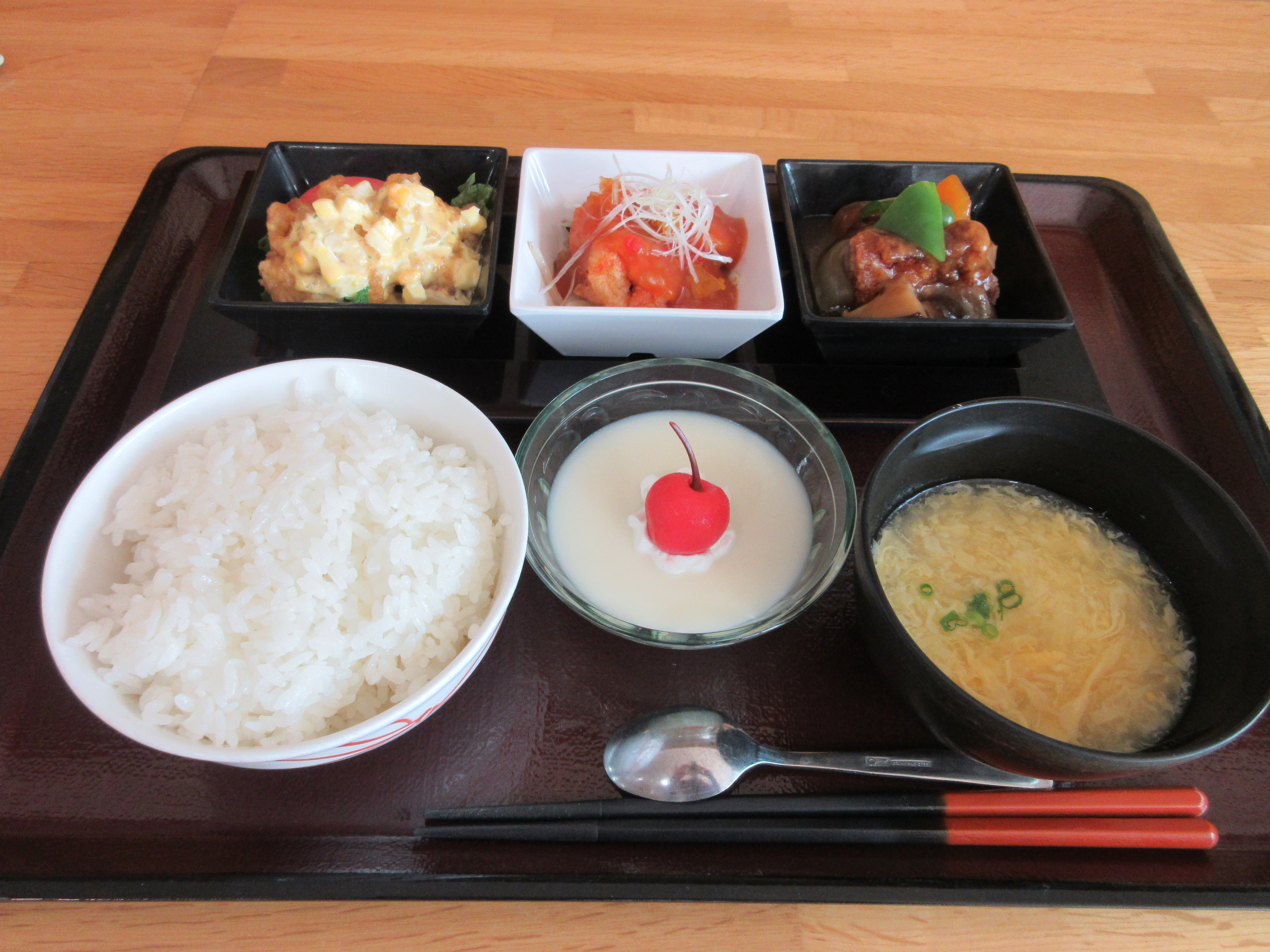 (献立)ご飯、チキン南蛮、エビチリ、酢豚、中華風コーンスープ、杏仁豆腐