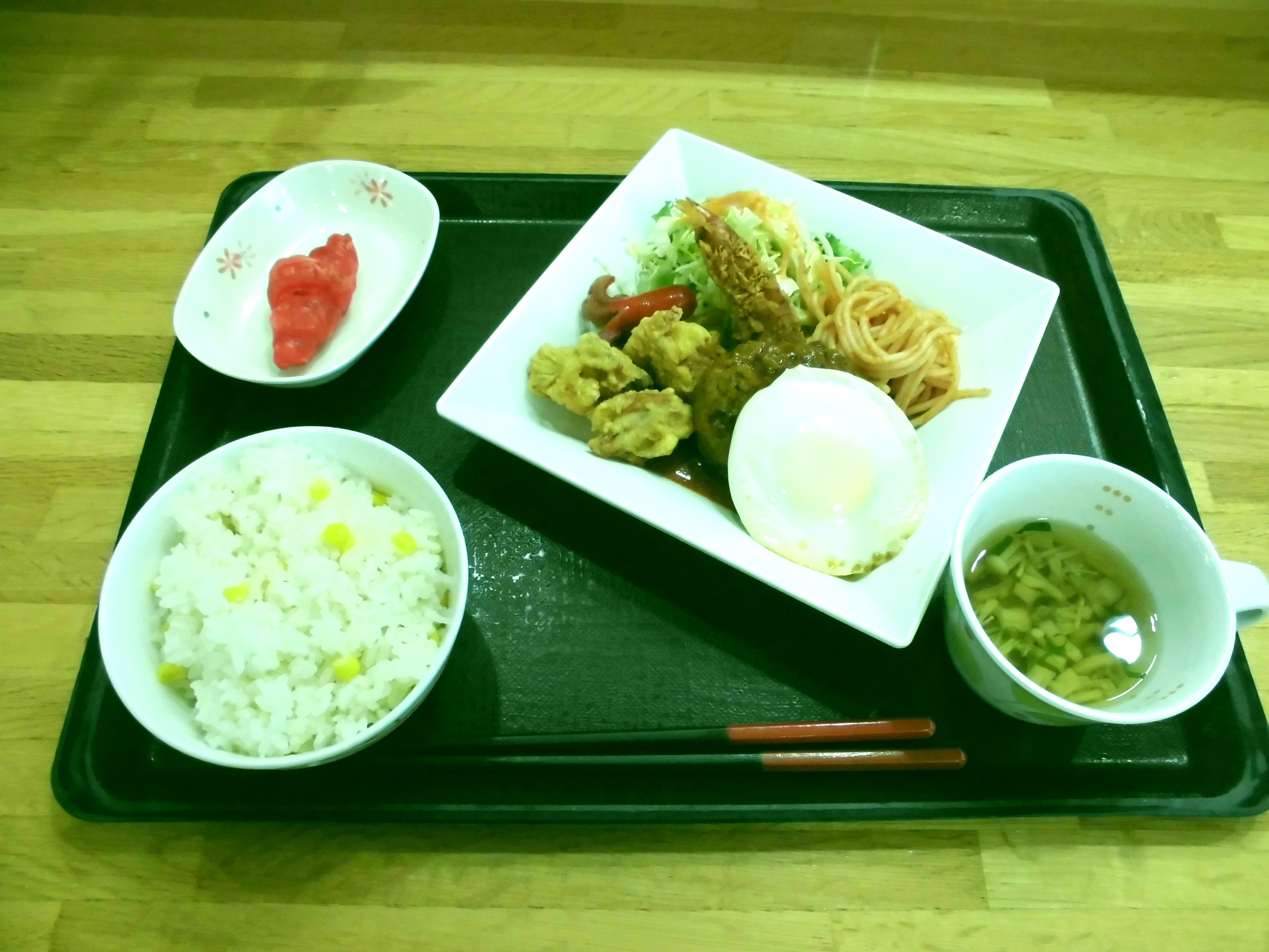 (献立)コーンライス、鶏の唐揚げ、煮込みハンバーグ、えびフライ&タコさんウインナー、