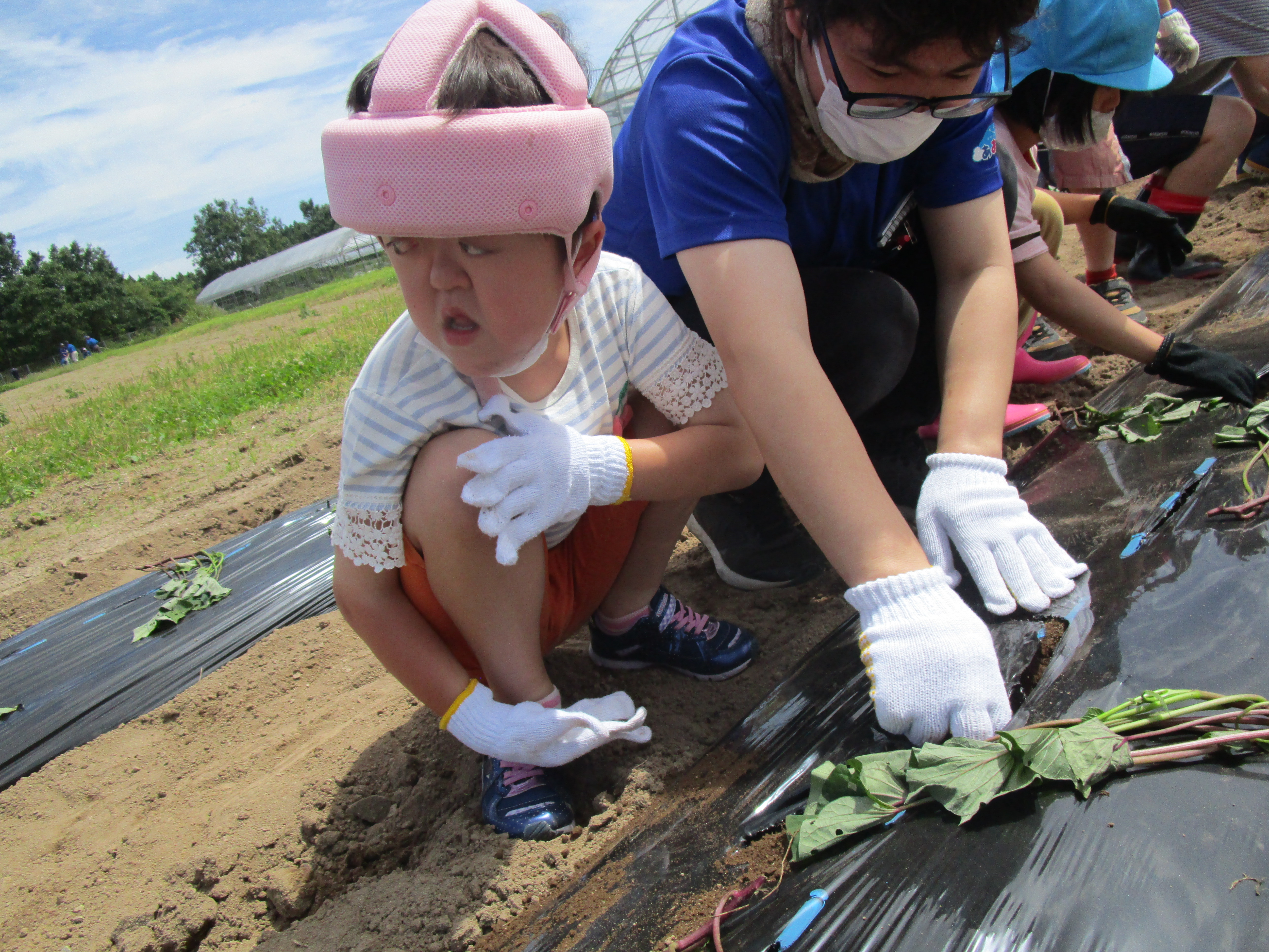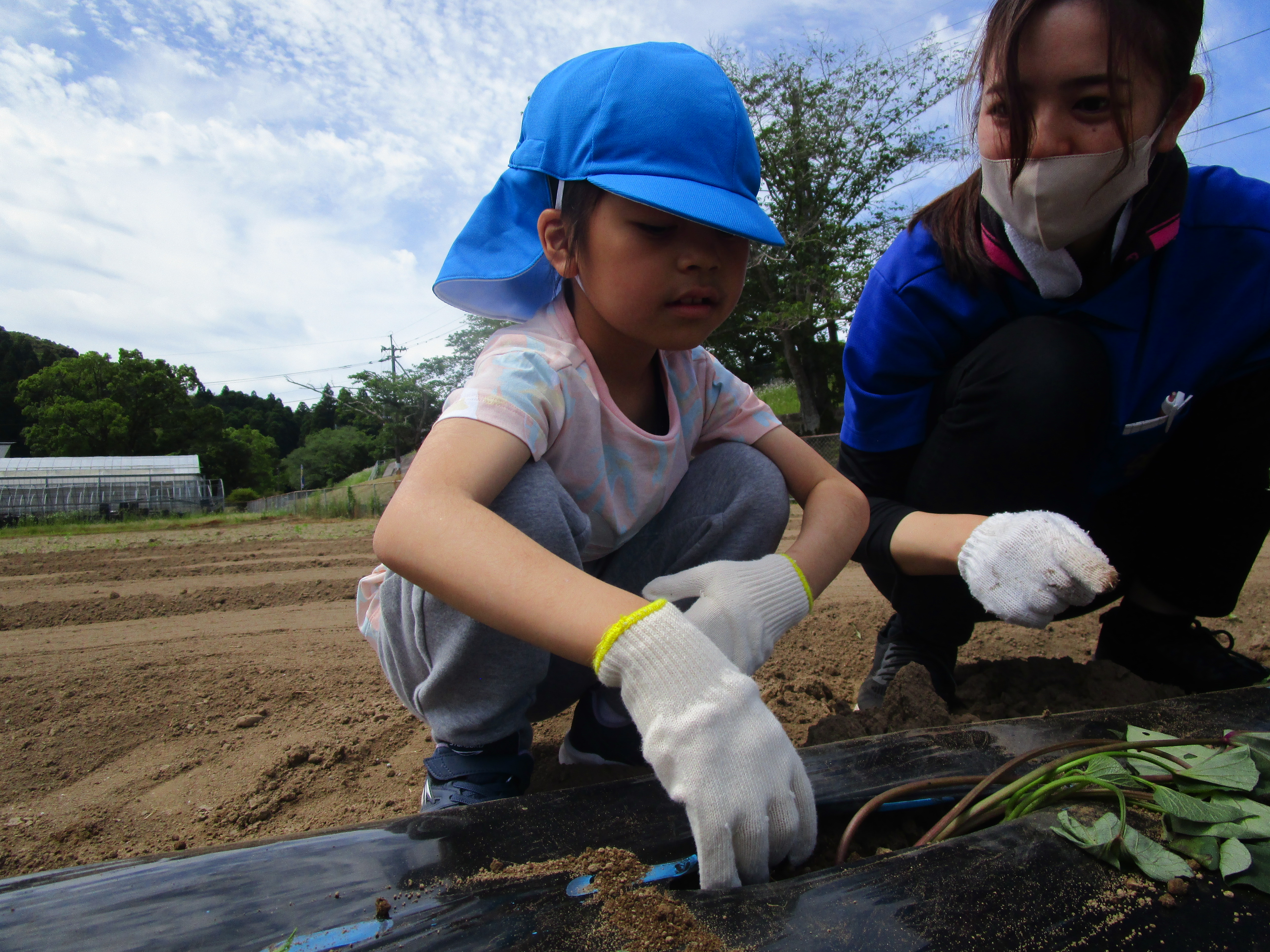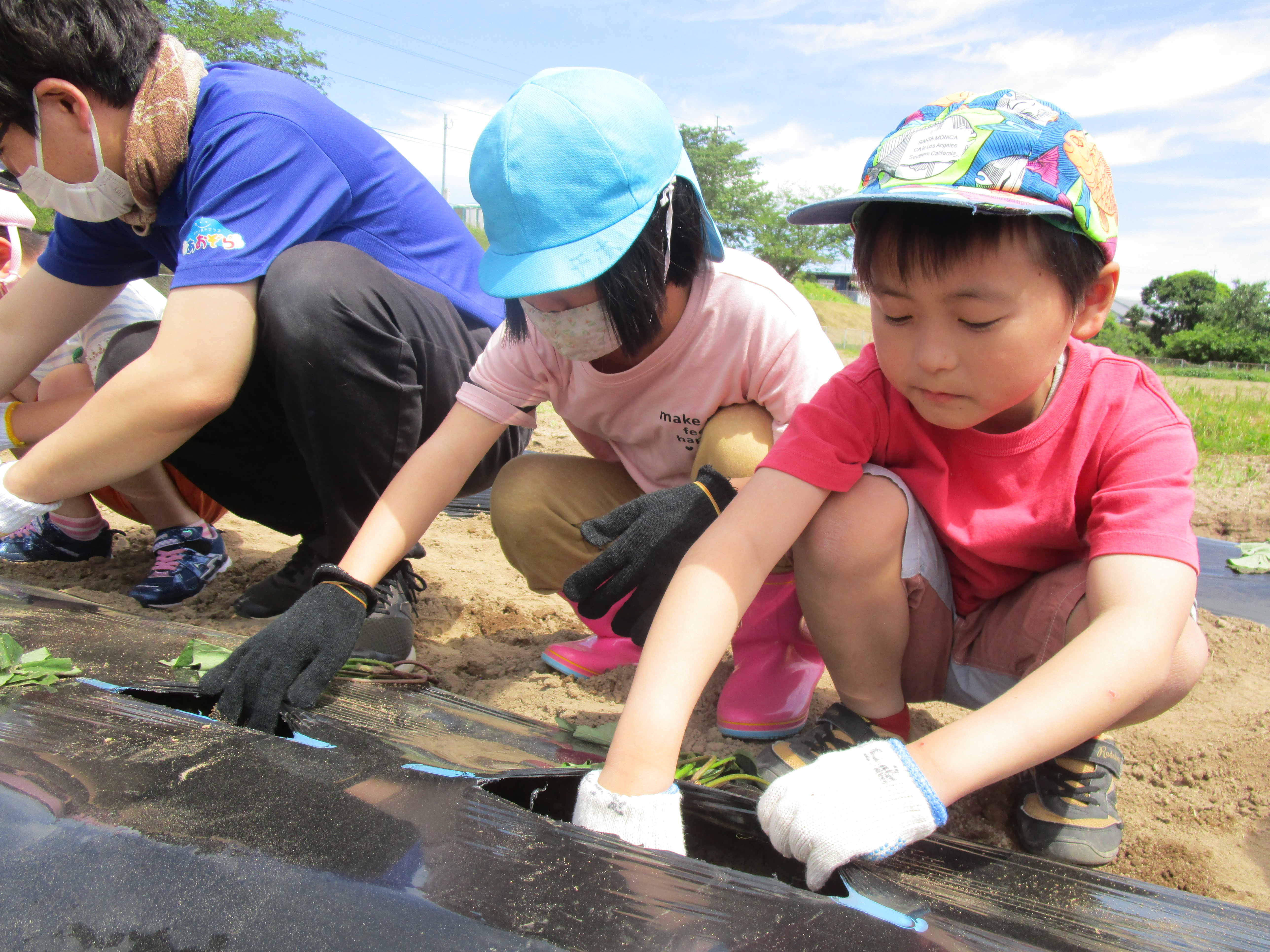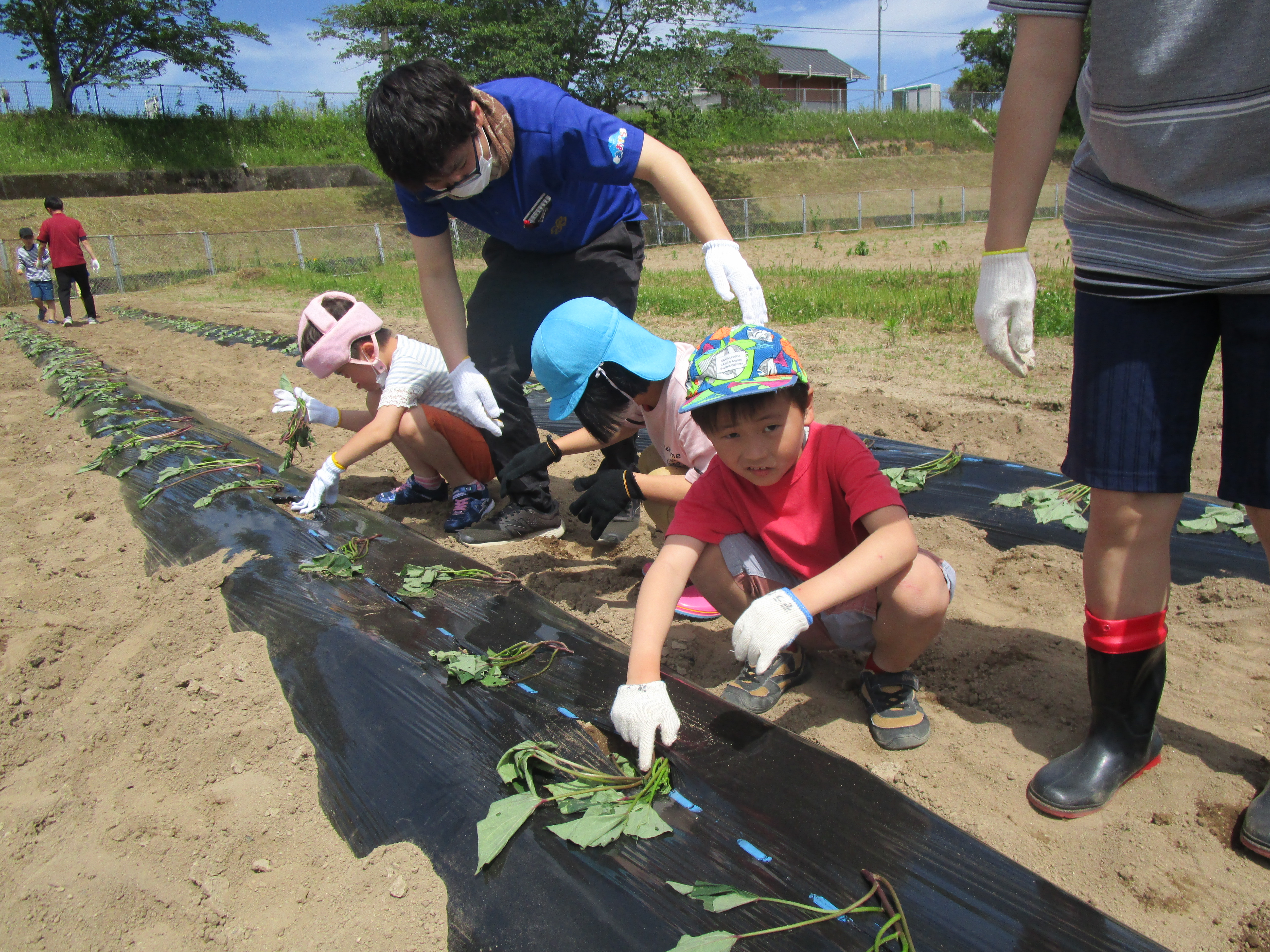 澄んだあおぞらの中、子どもたちみんなが夢中になって、一生懸命に苗植えに取り組んでおります。
