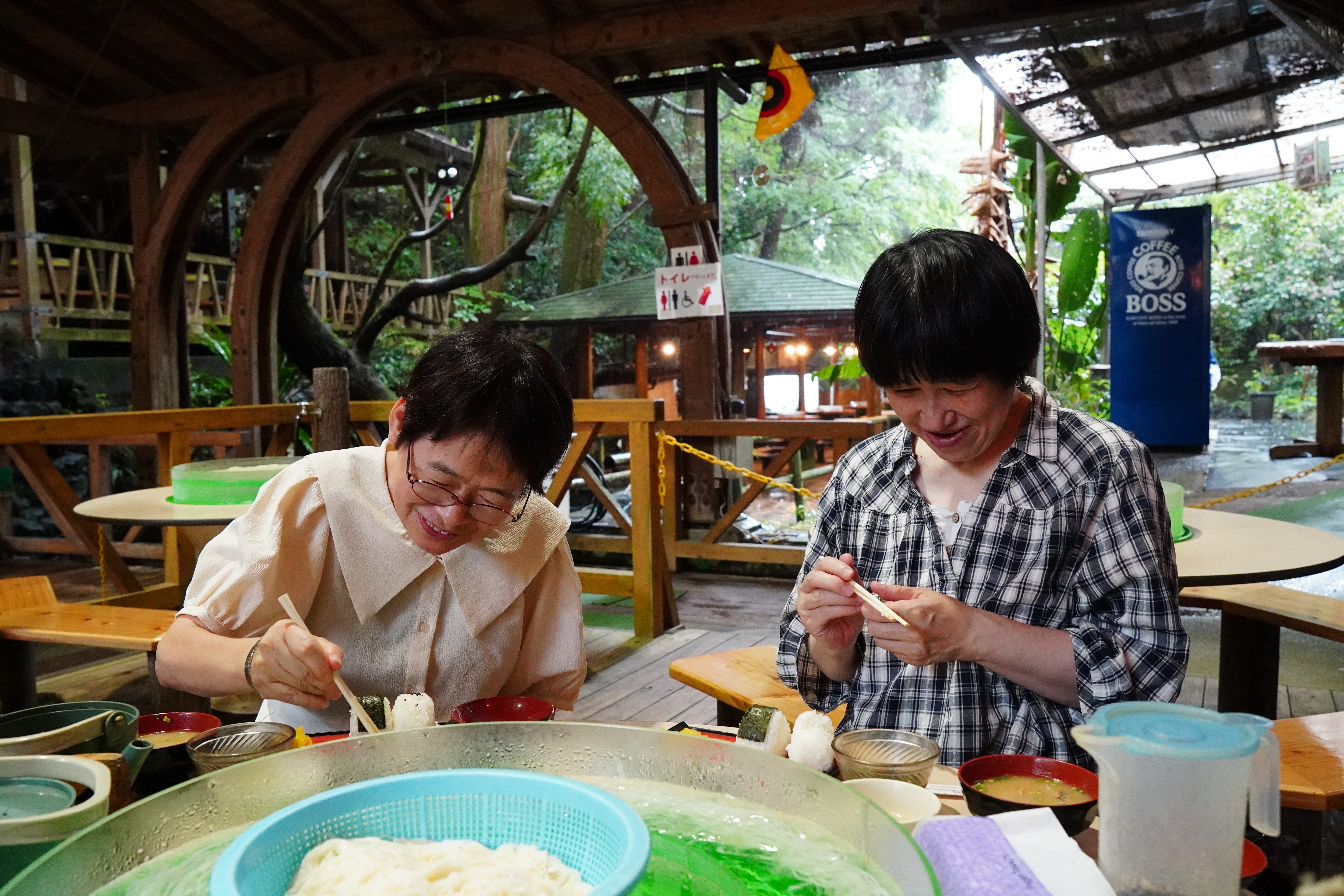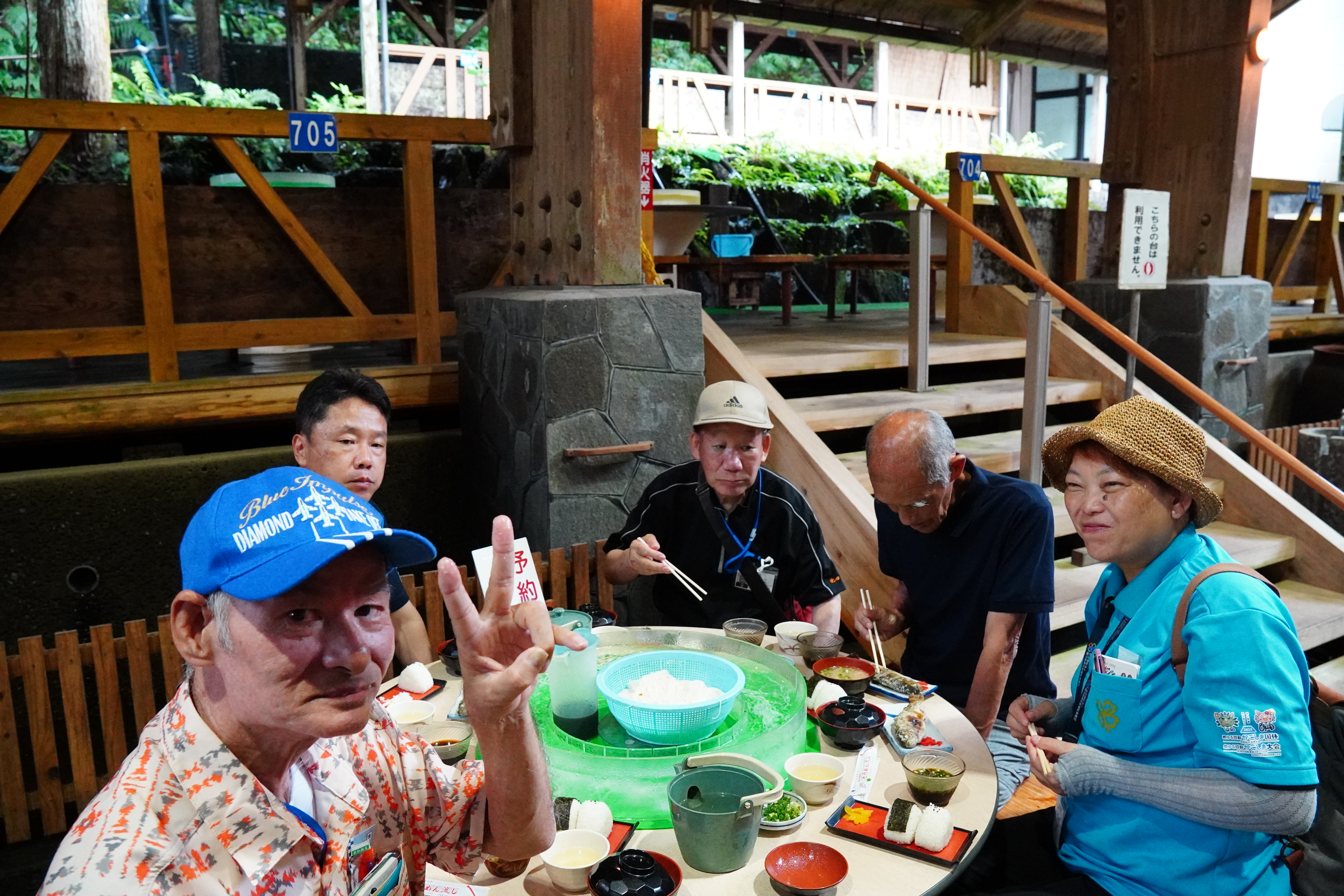 さすがに前日の豪華な夕食から朝食のバイキングと、普段に比べて大量に食べているため、箸がなかなか進まないかと思いきや、皆さんおいしそうに流れているそうめんを上手にすくい、ペロリと平らげていました。