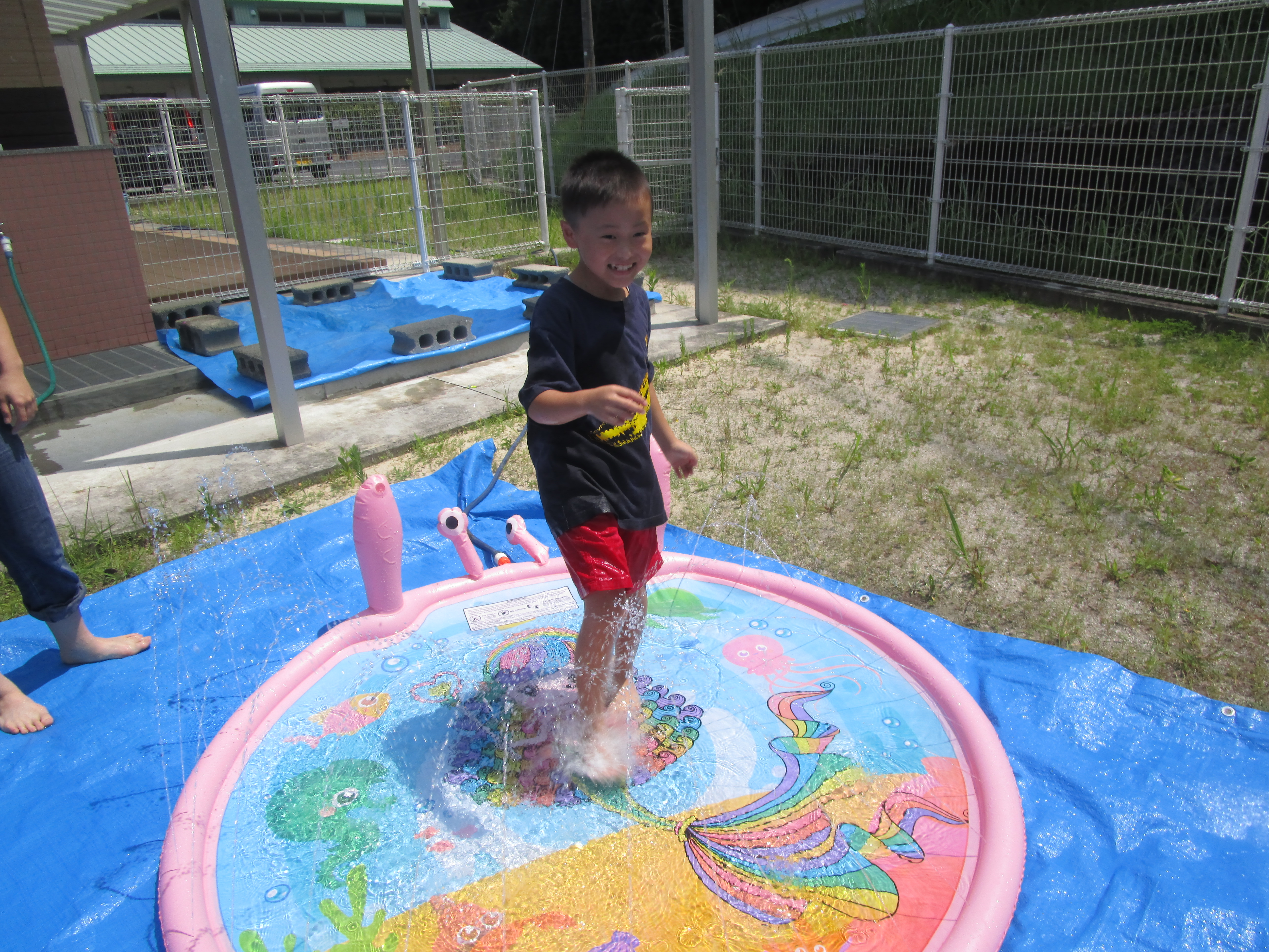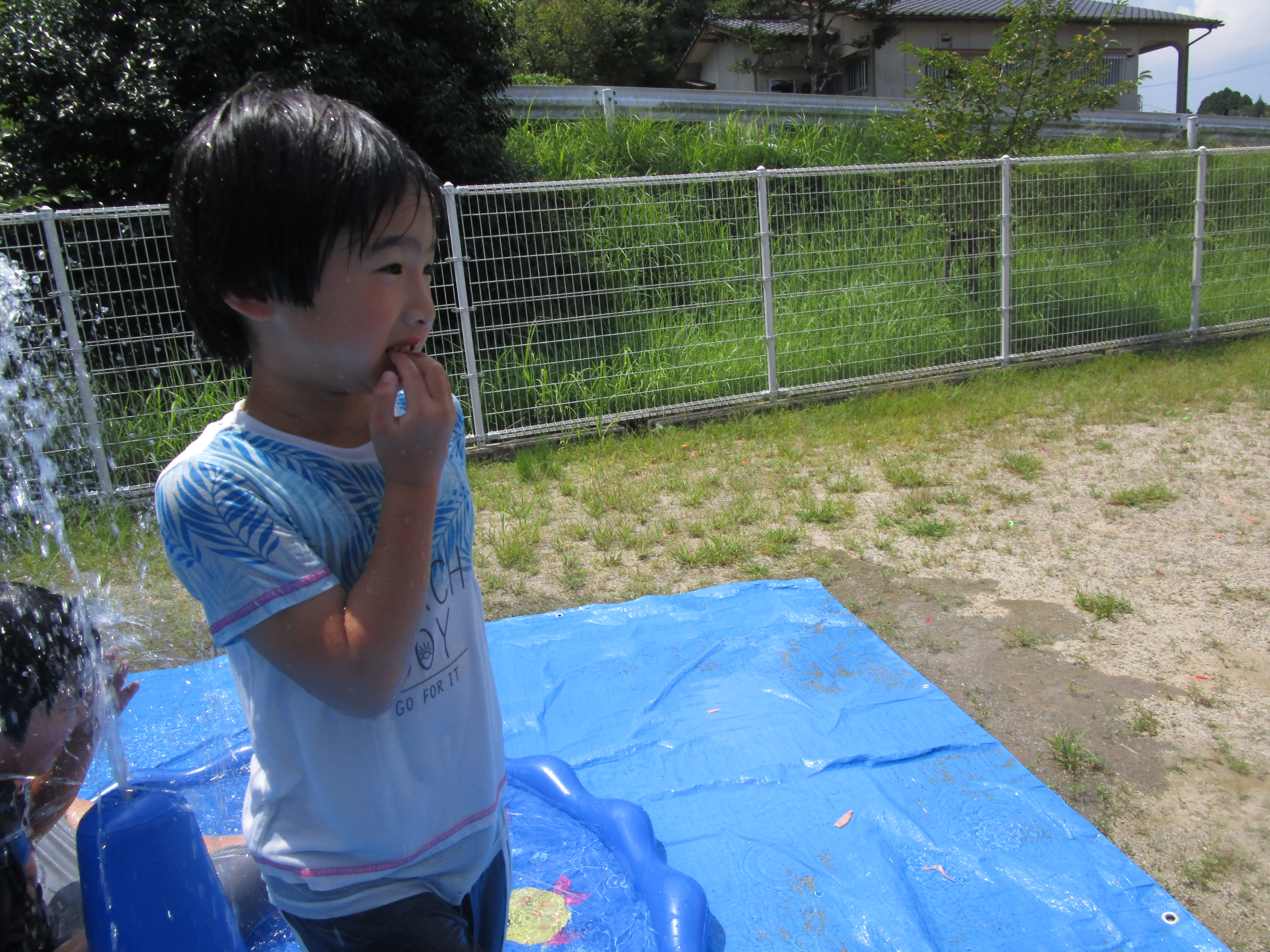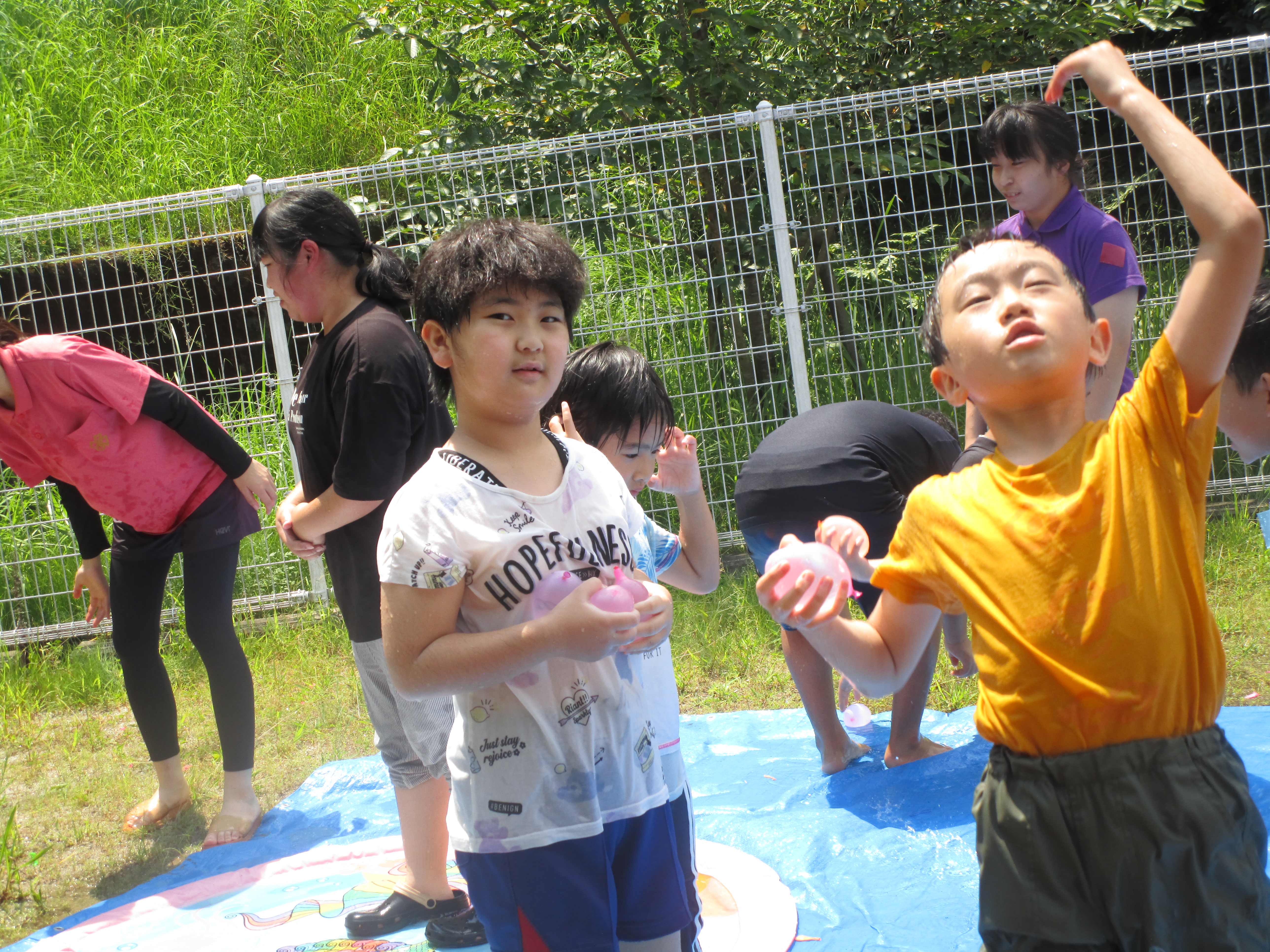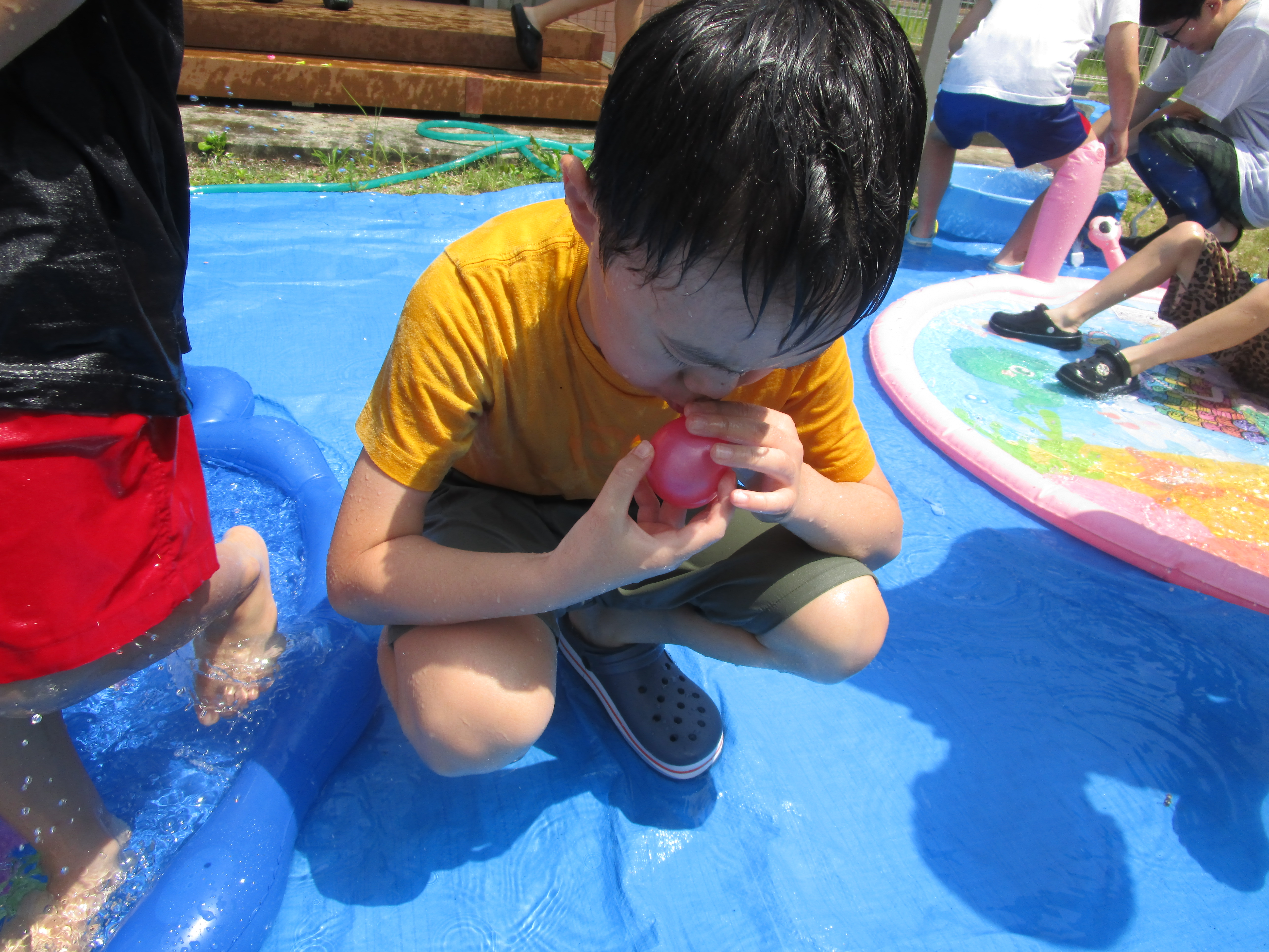 噴水プールや水風船、水鉄砲を用意して、お友達と一緒にかけ合って涼しく過ごしました。
