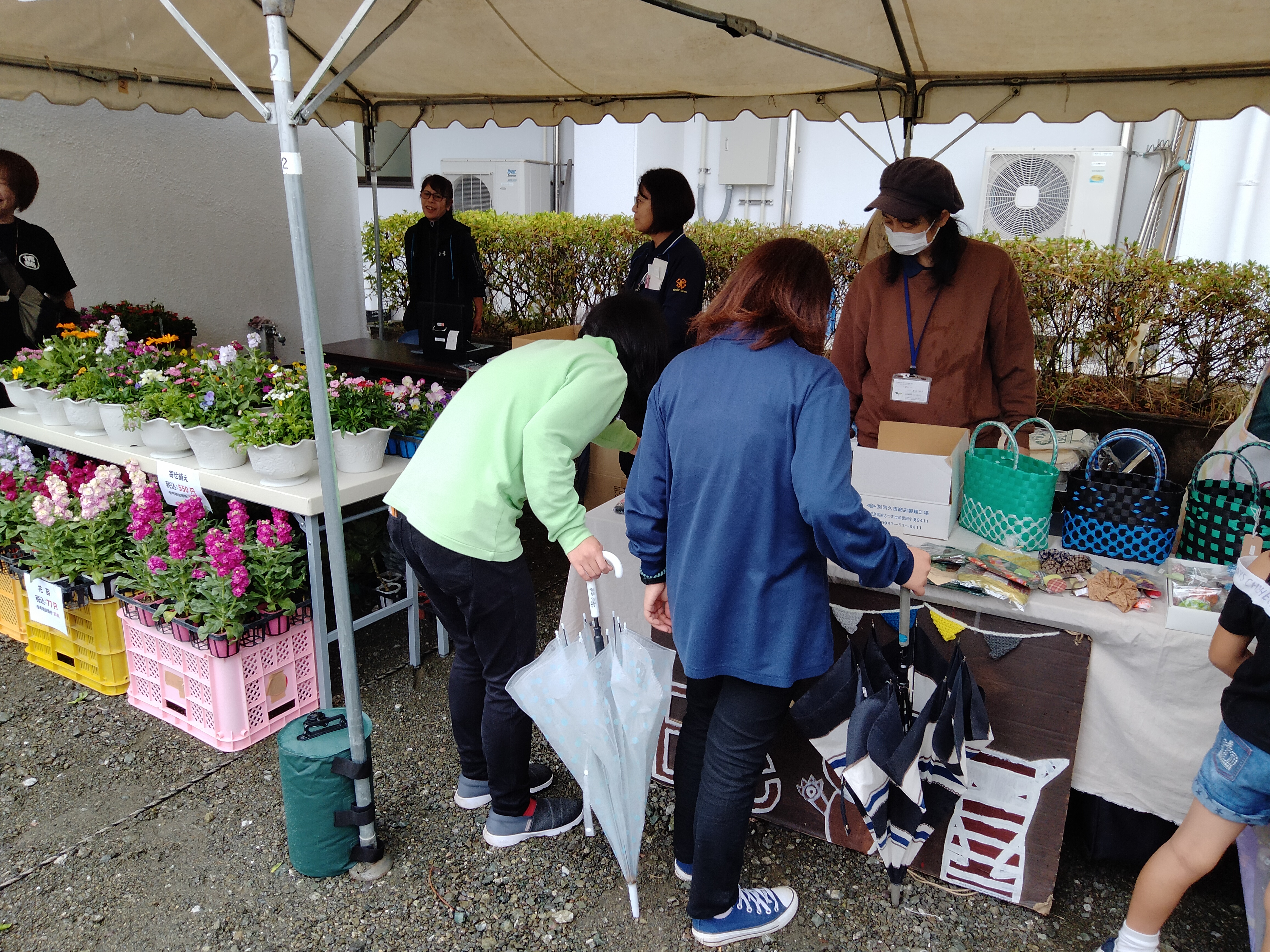それぞれの事業所が利用者さんといっしょに作った飲食物・花苗・野菜・創作品・手芸品がところ狭しと並んでいました。参加した利用者もアクセサリーやクラフト作品を手に取り、「かわいいね」と嬉しそうな表情♬多くの事業所さんの作品や生産物をみて、福祉的就労のイメージが湧いたのではないでしょうか。