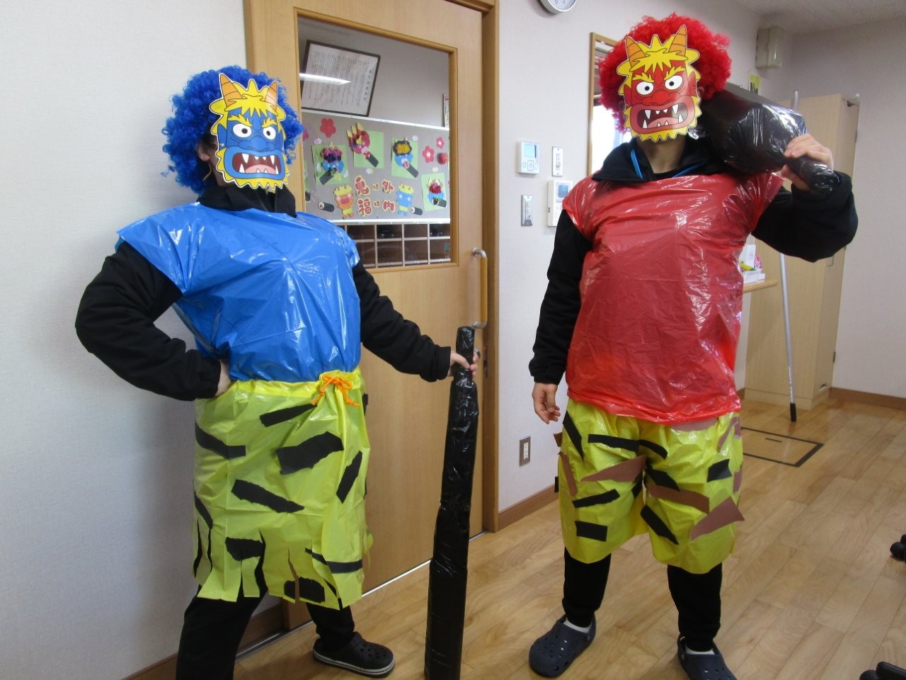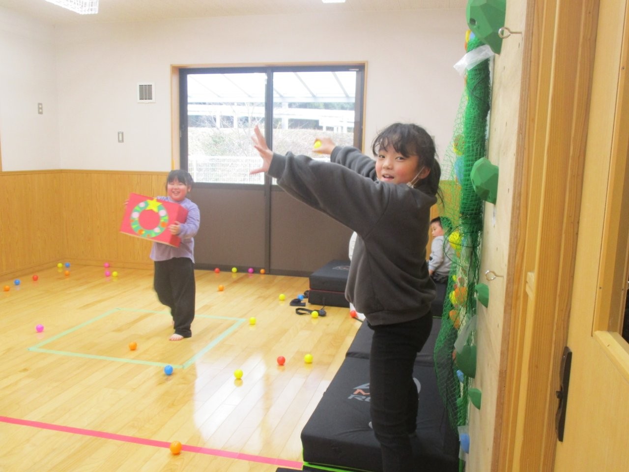 その後、遊戯室で豆に見立てたカラーボールを投げて、鬼退治をしました。