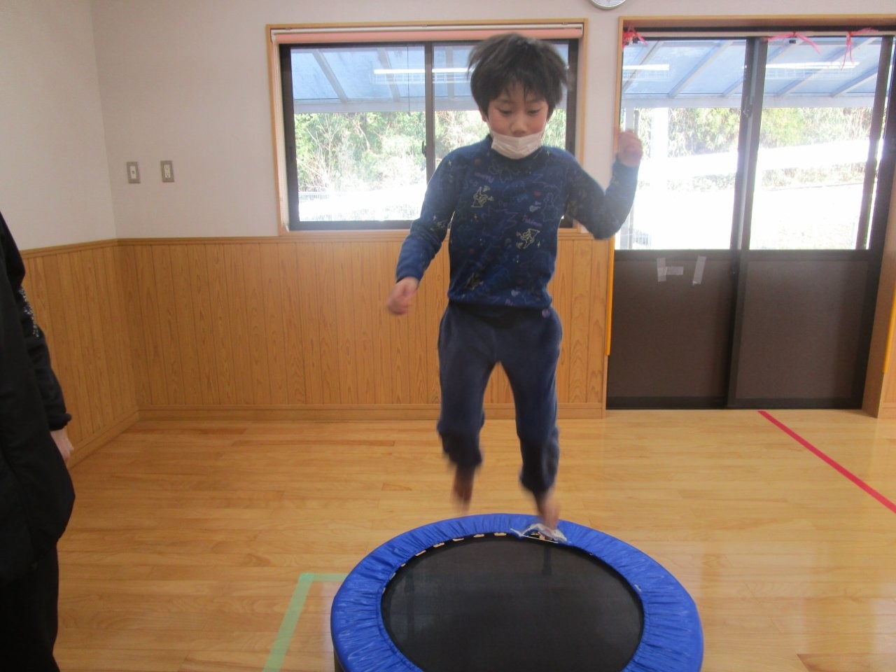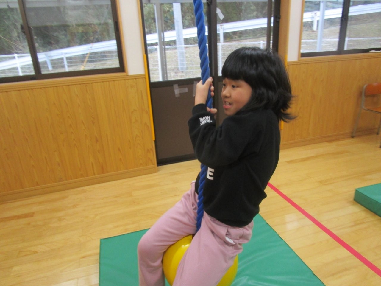 遊戯室では、スイングブイやタイヤロープ、トランポリン、風船バレーなどをして遊んでいます。