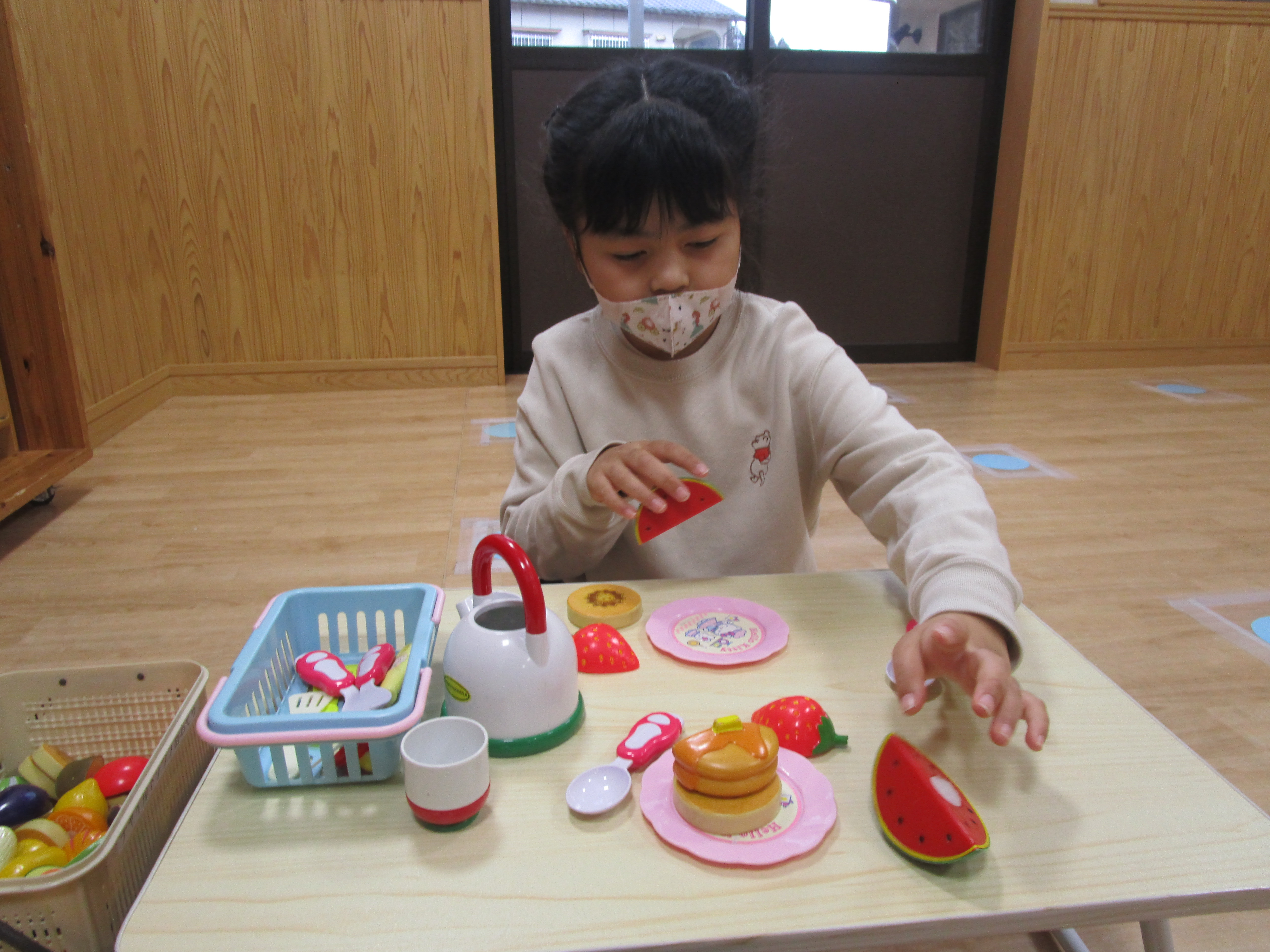お友達とお話をしながら、おままごとやお買いものごっこなど、ごっこ遊びをしている様子もみられます。