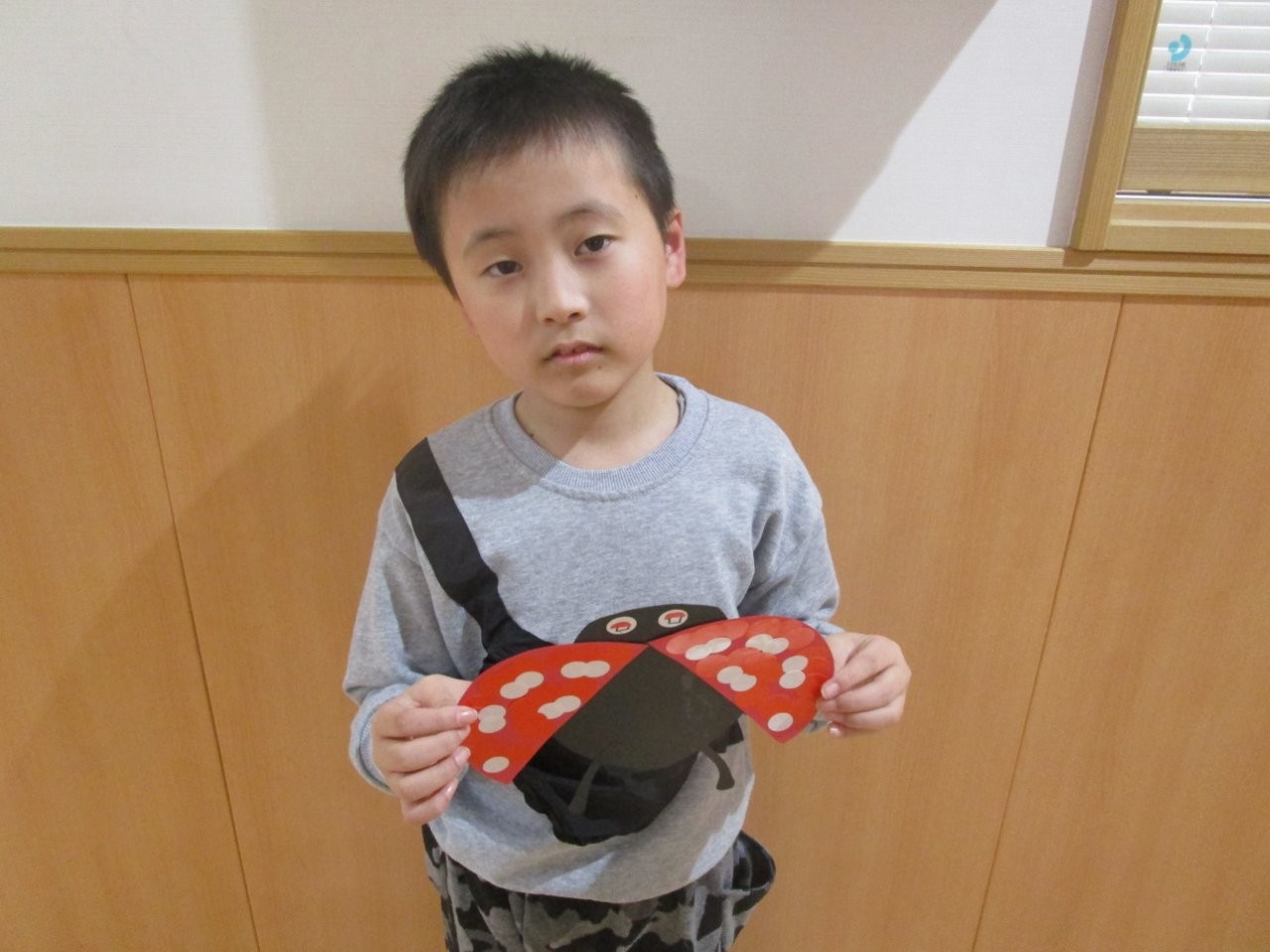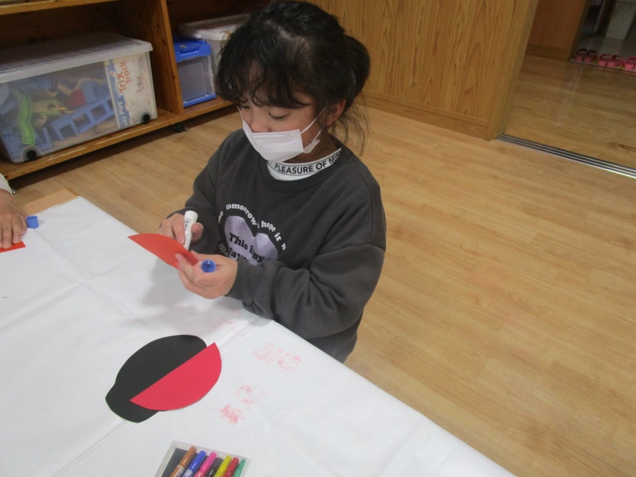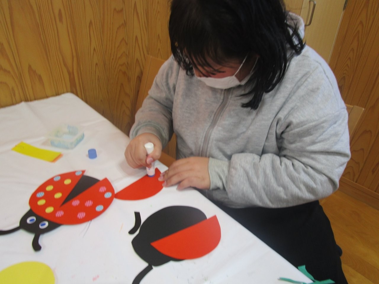 てんとう虫は、羽の部分に丸シールを貼って可愛い模様をつけ、