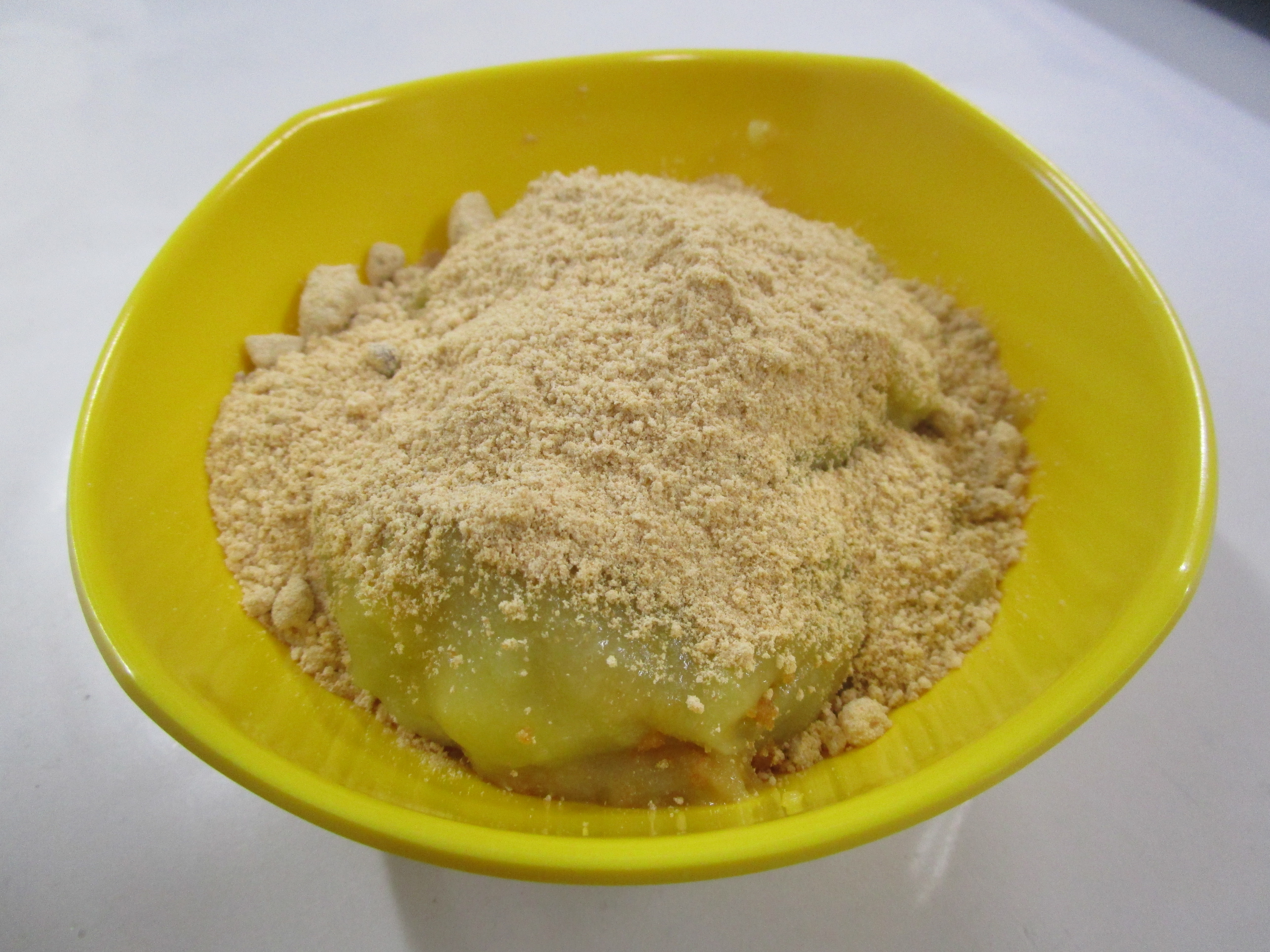 ふかしたサツマイモとお餅を潰して混ぜて、最後にきな粉をかけて完成です。